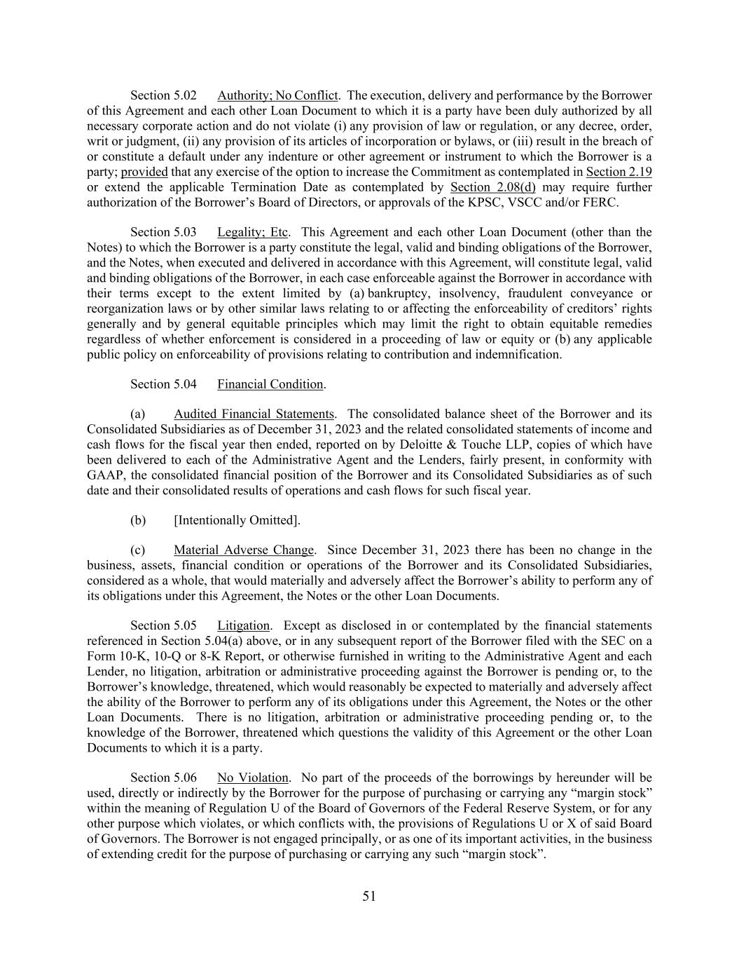 51 Section 5.02 Authority; No Conflict. The execution, delivery and performance by the Borrower of this Agreement and each other Loan Document to which it is a party have been duly authorized by all necessary corporate action and do not violate (i) any provision of law or regulation, or any decree, order, writ or judgment, (ii) any provision of its articles of incorporation or bylaws, or (iii) result in the breach of or constitute a default under any indenture or other agreement or instrument to which the Borrower is a party; provided that any exercise of the option to increase the Commitment as contemplated in Section 2.19 or extend the applicable Termination Date as contemplated by Section 2.08(d) may require further authorization of the Borrower’s Board of Directors, or approvals of the KPSC, VSCC and/or FERC. Section 5.03 Legality; Etc. This Agreement and each other Loan Document (other than the Notes) to which the Borrower is a party constitute the legal, valid and binding obligations of the Borrower, and the Notes, when executed and delivered in accordance with this Agreement, will constitute legal, valid and binding obligations of the Borrower, in each case enforceable against the Borrower in accordance with their terms except to the extent limited by (a) bankruptcy, insolvency, fraudulent conveyance or reorganization laws or by other similar laws relating to or affecting the enforceability of creditors’ rights generally and by general equitable principles which may limit the right to obtain equitable remedies regardless of whether enforcement is considered in a proceeding of law or equity or (b) any applicable public policy on enforceability of provisions relating to contribution and indemnification. Section 5.04 Financial Condition. (a) Audited Financial Statements. The consolidated balance sheet of the Borrower and its Consolidated Subsidiaries as of December 31, 2023 and the related consolidated statements of income and cash flows for the fiscal year then ended, reported on by Deloitte & Touche LLP, copies of which have been delivered to each of the Administrative Agent and the Lenders, fairly present, in conformity with GAAP, the consolidated financial position of the Borrower and its Consolidated Subsidiaries as of such date and their consolidated results of operations and cash flows for such fiscal year. (b) [Intentionally Omitted]. (c) Material Adverse Change. Since December 31, 2023 there has been no change in the business, assets, financial condition or operations of the Borrower and its Consolidated Subsidiaries, considered as a whole, that would materially and adversely affect the Borrower’s ability to perform any of its obligations under this Agreement, the Notes or the other Loan Documents. Section 5.05 Litigation. Except as disclosed in or contemplated by the financial statements referenced in Section 5.04(a) above, or in any subsequent report of the Borrower filed with the SEC on a Form 10-K, 10-Q or 8-K Report, or otherwise furnished in writing to the Administrative Agent and each Lender, no litigation, arbitration or administrative proceeding against the Borrower is pending or, to the Borrower’s knowledge, threatened, which would reasonably be expected to materially and adversely affect the ability of the Borrower to perform any of its obligations under this Agreement, the Notes or the other Loan Documents. There is no litigation, arbitration or administrative proceeding pending or, to the knowledge of the Borrower, threatened which questions the validity of this Agreement or the other Loan Documents to which it is a party. Section 5.06 No Violation. No part of the proceeds of the borrowings by hereunder will be used, directly or indirectly by the Borrower for the purpose of purchasing or carrying any “margin stock” within the meaning of Regulation U of the Board of Governors of the Federal Reserve System, or for any other purpose which violates, or which conflicts with, the provisions of Regulations U or X of said Board of Governors. The Borrower is not engaged principally, or as one of its important activities, in the business of extending credit for the purpose of purchasing or carrying any such “margin stock”.