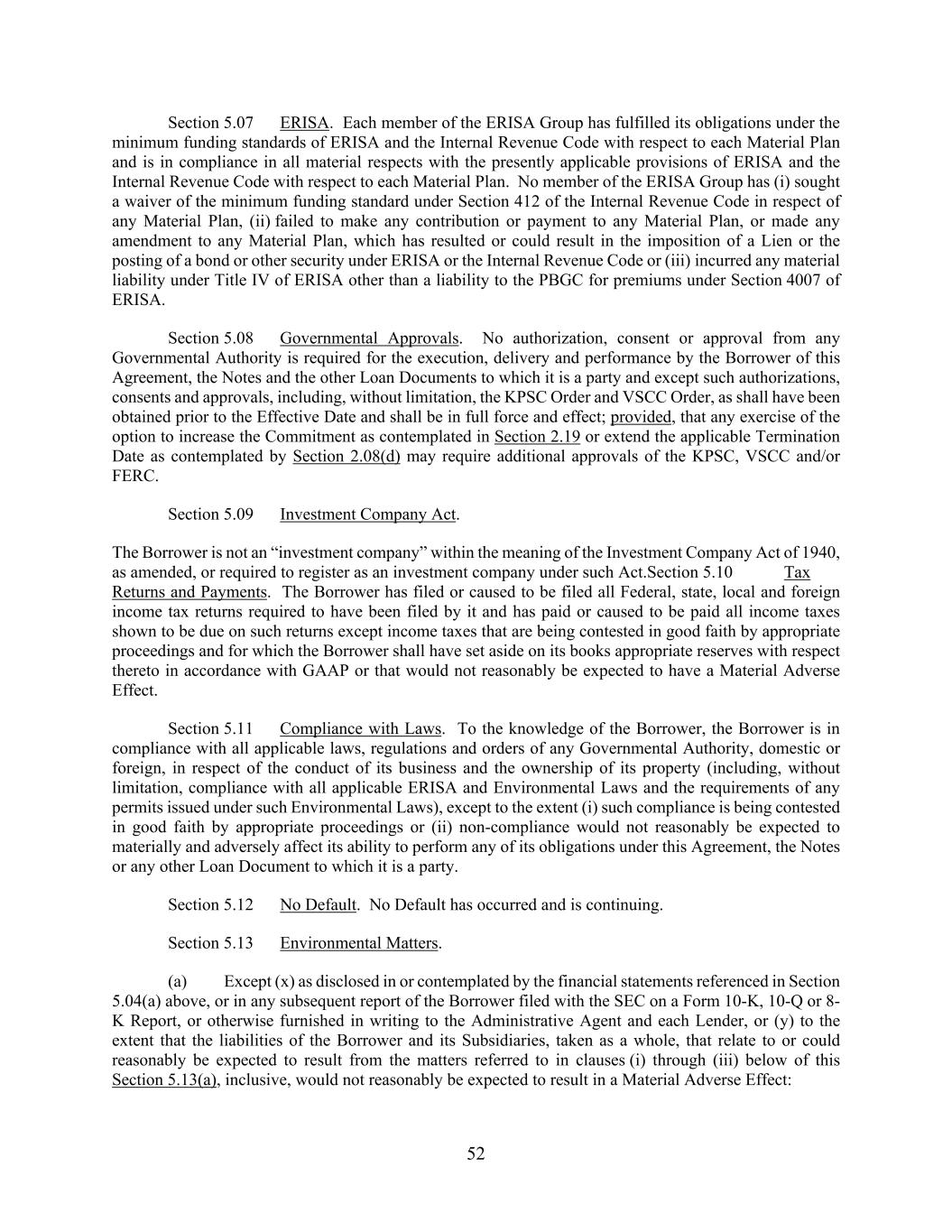 52 Section 5.07 ERISA. Each member of the ERISA Group has fulfilled its obligations under the minimum funding standards of ERISA and the Internal Revenue Code with respect to each Material Plan and is in compliance in all material respects with the presently applicable provisions of ERISA and the Internal Revenue Code with respect to each Material Plan. No member of the ERISA Group has (i) sought a waiver of the minimum funding standard under Section 412 of the Internal Revenue Code in respect of any Material Plan, (ii) failed to make any contribution or payment to any Material Plan, or made any amendment to any Material Plan, which has resulted or could result in the imposition of a Lien or the posting of a bond or other security under ERISA or the Internal Revenue Code or (iii) incurred any material liability under Title IV of ERISA other than a liability to the PBGC for premiums under Section 4007 of ERISA. Section 5.08 Governmental Approvals. No authorization, consent or approval from any Governmental Authority is required for the execution, delivery and performance by the Borrower of this Agreement, the Notes and the other Loan Documents to which it is a party and except such authorizations, consents and approvals, including, without limitation, the KPSC Order and VSCC Order, as shall have been obtained prior to the Effective Date and shall be in full force and effect; provided, that any exercise of the option to increase the Commitment as contemplated in Section 2.19 or extend the applicable Termination Date as contemplated by Section 2.08(d) may require additional approvals of the KPSC, VSCC and/or FERC. Section 5.09 Investment Company Act. The Borrower is not an “investment company” within the meaning of the Investment Company Act of 1940, as amended, or required to register as an investment company under such Act.Section 5.10 Tax Returns and Payments. The Borrower has filed or caused to be filed all Federal, state, local and foreign income tax returns required to have been filed by it and has paid or caused to be paid all income taxes shown to be due on such returns except income taxes that are being contested in good faith by appropriate proceedings and for which the Borrower shall have set aside on its books appropriate reserves with respect thereto in accordance with GAAP or that would not reasonably be expected to have a Material Adverse Effect. Section 5.11 Compliance with Laws. To the knowledge of the Borrower, the Borrower is in compliance with all applicable laws, regulations and orders of any Governmental Authority, domestic or foreign, in respect of the conduct of its business and the ownership of its property (including, without limitation, compliance with all applicable ERISA and Environmental Laws and the requirements of any permits issued under such Environmental Laws), except to the extent (i) such compliance is being contested in good faith by appropriate proceedings or (ii) non-compliance would not reasonably be expected to materially and adversely affect its ability to perform any of its obligations under this Agreement, the Notes or any other Loan Document to which it is a party. Section 5.12 No Default. No Default has occurred and is continuing. Section 5.13 Environmental Matters. (a) Except (x) as disclosed in or contemplated by the financial statements referenced in Section 5.04(a) above, or in any subsequent report of the Borrower filed with the SEC on a Form 10-K, 10-Q or 8- K Report, or otherwise furnished in writing to the Administrative Agent and each Lender, or (y) to the extent that the liabilities of the Borrower and its Subsidiaries, taken as a whole, that relate to or could reasonably be expected to result from the matters referred to in clauses (i) through (iii) below of this Section 5.13(a), inclusive, would not reasonably be expected to result in a Material Adverse Effect: