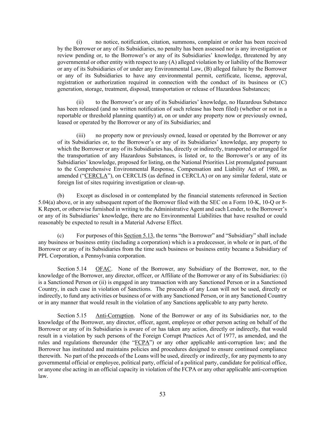 53 (i) no notice, notification, citation, summons, complaint or order has been received by the Borrower or any of its Subsidiaries, no penalty has been assessed nor is any investigation or review pending or, to the Borrower’s or any of its Subsidiaries’ knowledge, threatened by any governmental or other entity with respect to any (A) alleged violation by or liability of the Borrower or any of its Subsidiaries of or under any Environmental Law, (B) alleged failure by the Borrower or any of its Subsidiaries to have any environmental permit, certificate, license, approval, registration or authorization required in connection with the conduct of its business or (C) generation, storage, treatment, disposal, transportation or release of Hazardous Substances; (ii) to the Borrower’s or any of its Subsidiaries’ knowledge, no Hazardous Substance has been released (and no written notification of such release has been filed) (whether or not in a reportable or threshold planning quantity) at, on or under any property now or previously owned, leased or operated by the Borrower or any of its Subsidiaries; and (iii) no property now or previously owned, leased or operated by the Borrower or any of its Subsidiaries or, to the Borrower’s or any of its Subsidiaries’ knowledge, any property to which the Borrower or any of its Subsidiaries has, directly or indirectly, transported or arranged for the transportation of any Hazardous Substances, is listed or, to the Borrower’s or any of its Subsidiaries’ knowledge, proposed for listing, on the National Priorities List promulgated pursuant to the Comprehensive Environmental Response, Compensation and Liability Act of 1980, as amended (“CERCLA”), on CERCLIS (as defined in CERCLA) or on any similar federal, state or foreign list of sites requiring investigation or clean-up. (b) Except as disclosed in or contemplated by the financial statements referenced in Section 5.04(a) above, or in any subsequent report of the Borrower filed with the SEC on a Form 10-K, 10-Q or 8- K Report, or otherwise furnished in writing to the Administrative Agent and each Lender, to the Borrower’s or any of its Subsidiaries’ knowledge, there are no Environmental Liabilities that have resulted or could reasonably be expected to result in a Material Adverse Effect. (c) For purposes of this Section 5.13, the terms “the Borrower” and “Subsidiary” shall include any business or business entity (including a corporation) which is a predecessor, in whole or in part, of the Borrower or any of its Subsidiaries from the time such business or business entity became a Subsidiary of PPL Corporation, a Pennsylvania corporation. Section 5.14 OFAC. None of the Borrower, any Subsidiary of the Borrower, nor, to the knowledge of the Borrower, any director, officer, or Affiliate of the Borrower or any of its Subsidiaries: (i) is a Sanctioned Person or (ii) is engaged in any transaction with any Sanctioned Person or in a Sanctioned Country, in each case in violation of Sanctions. The proceeds of any Loan will not be used, directly or indirectly, to fund any activities or business of or with any Sanctioned Person, or in any Sanctioned Country or in any manner that would result in the violation of any Sanctions applicable to any party hereto. Section 5.15 Anti-Corruption. None of the Borrower or any of its Subsidiaries nor, to the knowledge of the Borrower, any director, officer, agent, employee or other person acting on behalf of the Borrower or any of its Subsidiaries is aware of or has taken any action, directly or indirectly, that would result in a violation by such persons of the Foreign Corrupt Practices Act of 1977, as amended, and the rules and regulations thereunder (the “FCPA”) or any other applicable anti-corruption law; and the Borrower has instituted and maintains policies and procedures designed to ensure continued compliance therewith. No part of the proceeds of the Loans will be used, directly or indirectly, for any payments to any governmental official or employee, political party, official of a political party, candidate for political office, or anyone else acting in an official capacity in violation of the FCPA or any other applicable anti-corruption law.