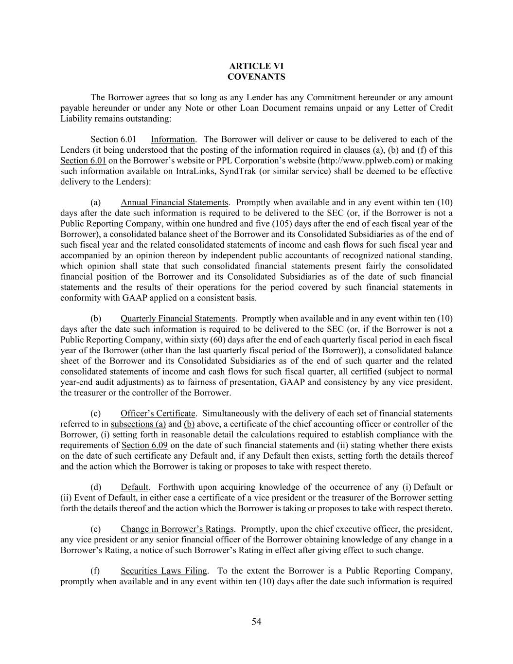 54 ARTICLE VI COVENANTS The Borrower agrees that so long as any Lender has any Commitment hereunder or any amount payable hereunder or under any Note or other Loan Document remains unpaid or any Letter of Credit Liability remains outstanding: Section 6.01 Information. The Borrower will deliver or cause to be delivered to each of the Lenders (it being understood that the posting of the information required in clauses (a), (b) and (f) of this Section 6.01 on the Borrower’s website or PPL Corporation’s website (http://www.pplweb.com) or making such information available on IntraLinks, SyndTrak (or similar service) shall be deemed to be effective delivery to the Lenders): (a) Annual Financial Statements. Promptly when available and in any event within ten (10) days after the date such information is required to be delivered to the SEC (or, if the Borrower is not a Public Reporting Company, within one hundred and five (105) days after the end of each fiscal year of the Borrower), a consolidated balance sheet of the Borrower and its Consolidated Subsidiaries as of the end of such fiscal year and the related consolidated statements of income and cash flows for such fiscal year and accompanied by an opinion thereon by independent public accountants of recognized national standing, which opinion shall state that such consolidated financial statements present fairly the consolidated financial position of the Borrower and its Consolidated Subsidiaries as of the date of such financial statements and the results of their operations for the period covered by such financial statements in conformity with GAAP applied on a consistent basis. (b) Quarterly Financial Statements. Promptly when available and in any event within ten (10) days after the date such information is required to be delivered to the SEC (or, if the Borrower is not a Public Reporting Company, within sixty (60) days after the end of each quarterly fiscal period in each fiscal year of the Borrower (other than the last quarterly fiscal period of the Borrower)), a consolidated balance sheet of the Borrower and its Consolidated Subsidiaries as of the end of such quarter and the related consolidated statements of income and cash flows for such fiscal quarter, all certified (subject to normal year-end audit adjustments) as to fairness of presentation, GAAP and consistency by any vice president, the treasurer or the controller of the Borrower. (c) Officer’s Certificate. Simultaneously with the delivery of each set of financial statements referred to in subsections (a) and (b) above, a certificate of the chief accounting officer or controller of the Borrower, (i) setting forth in reasonable detail the calculations required to establish compliance with the requirements of Section 6.09 on the date of such financial statements and (ii) stating whether there exists on the date of such certificate any Default and, if any Default then exists, setting forth the details thereof and the action which the Borrower is taking or proposes to take with respect thereto. (d) Default. Forthwith upon acquiring knowledge of the occurrence of any (i) Default or (ii) Event of Default, in either case a certificate of a vice president or the treasurer of the Borrower setting forth the details thereof and the action which the Borrower is taking or proposes to take with respect thereto. (e) Change in Borrower’s Ratings. Promptly, upon the chief executive officer, the president, any vice president or any senior financial officer of the Borrower obtaining knowledge of any change in a Borrower’s Rating, a notice of such Borrower’s Rating in effect after giving effect to such change. (f) Securities Laws Filing. To the extent the Borrower is a Public Reporting Company, promptly when available and in any event within ten (10) days after the date such information is required