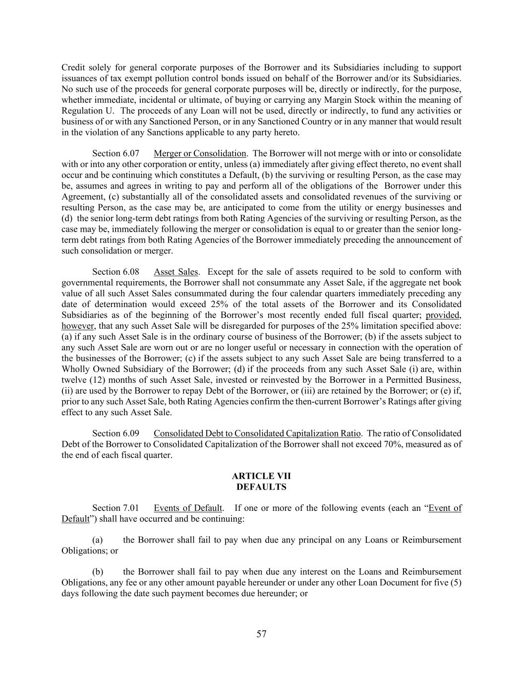 57 Credit solely for general corporate purposes of the Borrower and its Subsidiaries including to support issuances of tax exempt pollution control bonds issued on behalf of the Borrower and/or its Subsidiaries. No such use of the proceeds for general corporate purposes will be, directly or indirectly, for the purpose, whether immediate, incidental or ultimate, of buying or carrying any Margin Stock within the meaning of Regulation U. The proceeds of any Loan will not be used, directly or indirectly, to fund any activities or business of or with any Sanctioned Person, or in any Sanctioned Country or in any manner that would result in the violation of any Sanctions applicable to any party hereto. Section 6.07 Merger or Consolidation. The Borrower will not merge with or into or consolidate with or into any other corporation or entity, unless (a) immediately after giving effect thereto, no event shall occur and be continuing which constitutes a Default, (b) the surviving or resulting Person, as the case may be, assumes and agrees in writing to pay and perform all of the obligations of the Borrower under this Agreement, (c) substantially all of the consolidated assets and consolidated revenues of the surviving or resulting Person, as the case may be, are anticipated to come from the utility or energy businesses and (d) the senior long-term debt ratings from both Rating Agencies of the surviving or resulting Person, as the case may be, immediately following the merger or consolidation is equal to or greater than the senior long- term debt ratings from both Rating Agencies of the Borrower immediately preceding the announcement of such consolidation or merger. Section 6.08 Asset Sales. Except for the sale of assets required to be sold to conform with governmental requirements, the Borrower shall not consummate any Asset Sale, if the aggregate net book value of all such Asset Sales consummated during the four calendar quarters immediately preceding any date of determination would exceed 25% of the total assets of the Borrower and its Consolidated Subsidiaries as of the beginning of the Borrower’s most recently ended full fiscal quarter; provided, however, that any such Asset Sale will be disregarded for purposes of the 25% limitation specified above: (a) if any such Asset Sale is in the ordinary course of business of the Borrower; (b) if the assets subject to any such Asset Sale are worn out or are no longer useful or necessary in connection with the operation of the businesses of the Borrower; (c) if the assets subject to any such Asset Sale are being transferred to a Wholly Owned Subsidiary of the Borrower; (d) if the proceeds from any such Asset Sale (i) are, within twelve (12) months of such Asset Sale, invested or reinvested by the Borrower in a Permitted Business, (ii) are used by the Borrower to repay Debt of the Borrower, or (iii) are retained by the Borrower; or (e) if, prior to any such Asset Sale, both Rating Agencies confirm the then-current Borrower’s Ratings after giving effect to any such Asset Sale. Section 6.09 Consolidated Debt to Consolidated Capitalization Ratio. The ratio of Consolidated Debt of the Borrower to Consolidated Capitalization of the Borrower shall not exceed 70%, measured as of the end of each fiscal quarter. ARTICLE VII DEFAULTS Section 7.01 Events of Default. If one or more of the following events (each an “Event of Default”) shall have occurred and be continuing: (a) the Borrower shall fail to pay when due any principal on any Loans or Reimbursement Obligations; or (b) the Borrower shall fail to pay when due any interest on the Loans and Reimbursement Obligations, any fee or any other amount payable hereunder or under any other Loan Document for five (5) days following the date such payment becomes due hereunder; or