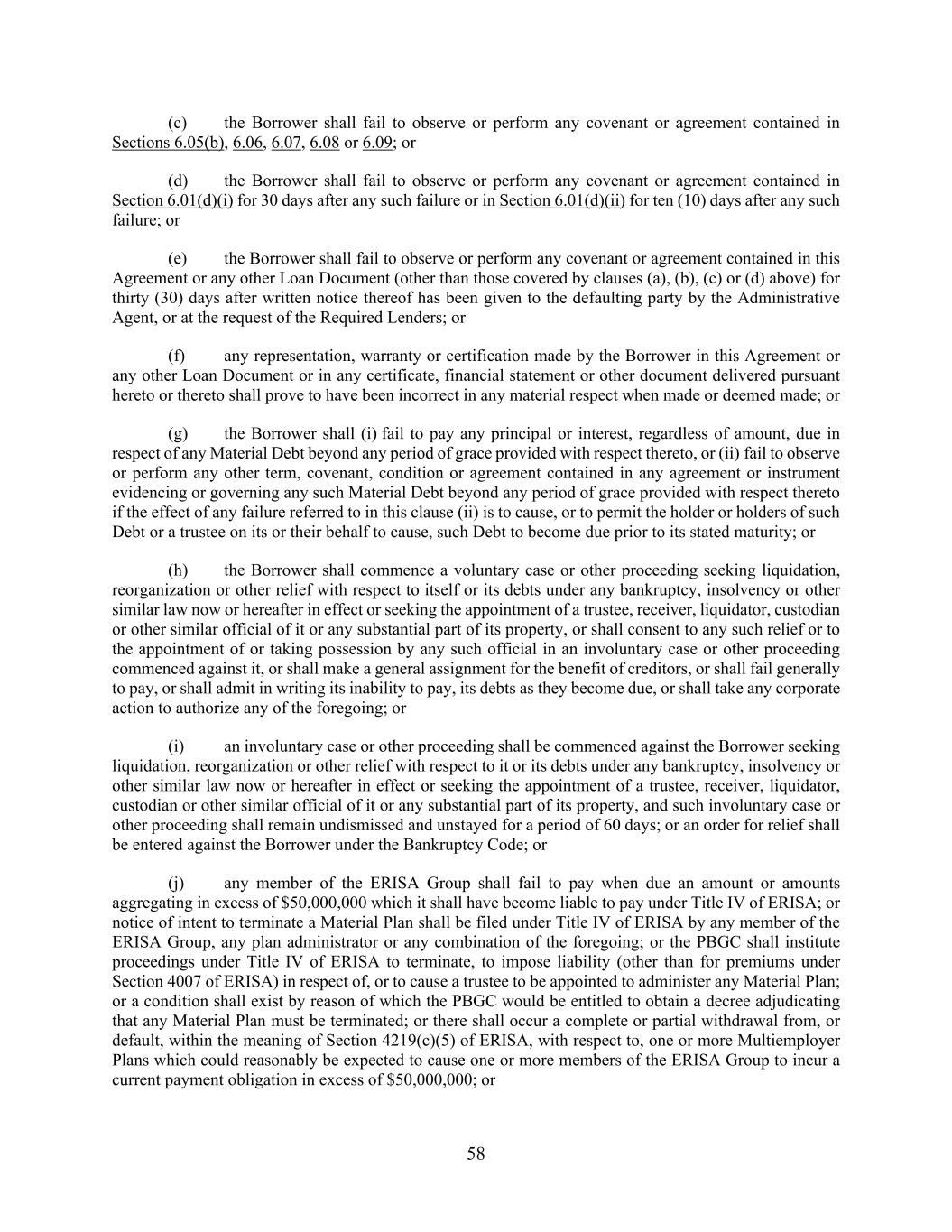 58 (c) the Borrower shall fail to observe or perform any covenant or agreement contained in Sections 6.05(b), 6.06, 6.07, 6.08 or 6.09; or (d) the Borrower shall fail to observe or perform any covenant or agreement contained in Section 6.01(d)(i) for 30 days after any such failure or in Section 6.01(d)(ii) for ten (10) days after any such failure; or (e) the Borrower shall fail to observe or perform any covenant or agreement contained in this Agreement or any other Loan Document (other than those covered by clauses (a), (b), (c) or (d) above) for thirty (30) days after written notice thereof has been given to the defaulting party by the Administrative Agent, or at the request of the Required Lenders; or (f) any representation, warranty or certification made by the Borrower in this Agreement or any other Loan Document or in any certificate, financial statement or other document delivered pursuant hereto or thereto shall prove to have been incorrect in any material respect when made or deemed made; or (g) the Borrower shall (i) fail to pay any principal or interest, regardless of amount, due in respect of any Material Debt beyond any period of grace provided with respect thereto, or (ii) fail to observe or perform any other term, covenant, condition or agreement contained in any agreement or instrument evidencing or governing any such Material Debt beyond any period of grace provided with respect thereto if the effect of any failure referred to in this clause (ii) is to cause, or to permit the holder or holders of such Debt or a trustee on its or their behalf to cause, such Debt to become due prior to its stated maturity; or (h) the Borrower shall commence a voluntary case or other proceeding seeking liquidation, reorganization or other relief with respect to itself or its debts under any bankruptcy, insolvency or other similar law now or hereafter in effect or seeking the appointment of a trustee, receiver, liquidator, custodian or other similar official of it or any substantial part of its property, or shall consent to any such relief or to the appointment of or taking possession by any such official in an involuntary case or other proceeding commenced against it, or shall make a general assignment for the benefit of creditors, or shall fail generally to pay, or shall admit in writing its inability to pay, its debts as they become due, or shall take any corporate action to authorize any of the foregoing; or (i) an involuntary case or other proceeding shall be commenced against the Borrower seeking liquidation, reorganization or other relief with respect to it or its debts under any bankruptcy, insolvency or other similar law now or hereafter in effect or seeking the appointment of a trustee, receiver, liquidator, custodian or other similar official of it or any substantial part of its property, and such involuntary case or other proceeding shall remain undismissed and unstayed for a period of 60 days; or an order for relief shall be entered against the Borrower under the Bankruptcy Code; or (j) any member of the ERISA Group shall fail to pay when due an amount or amounts aggregating in excess of $50,000,000 which it shall have become liable to pay under Title IV of ERISA; or notice of intent to terminate a Material Plan shall be filed under Title IV of ERISA by any member of the ERISA Group, any plan administrator or any combination of the foregoing; or the PBGC shall institute proceedings under Title IV of ERISA to terminate, to impose liability (other than for premiums under Section 4007 of ERISA) in respect of, or to cause a trustee to be appointed to administer any Material Plan; or a condition shall exist by reason of which the PBGC would be entitled to obtain a decree adjudicating that any Material Plan must be terminated; or there shall occur a complete or partial withdrawal from, or default, within the meaning of Section 4219(c)(5) of ERISA, with respect to, one or more Multiemployer Plans which could reasonably be expected to cause one or more members of the ERISA Group to incur a current payment obligation in excess of $50,000,000; or