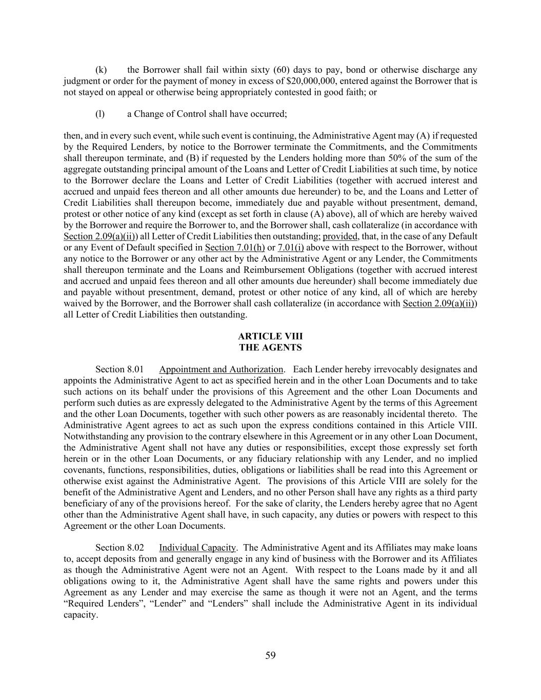 59 (k) the Borrower shall fail within sixty (60) days to pay, bond or otherwise discharge any judgment or order for the payment of money in excess of $20,000,000, entered against the Borrower that is not stayed on appeal or otherwise being appropriately contested in good faith; or (l) a Change of Control shall have occurred; then, and in every such event, while such event is continuing, the Administrative Agent may (A) if requested by the Required Lenders, by notice to the Borrower terminate the Commitments, and the Commitments shall thereupon terminate, and (B) if requested by the Lenders holding more than 50% of the sum of the aggregate outstanding principal amount of the Loans and Letter of Credit Liabilities at such time, by notice to the Borrower declare the Loans and Letter of Credit Liabilities (together with accrued interest and accrued and unpaid fees thereon and all other amounts due hereunder) to be, and the Loans and Letter of Credit Liabilities shall thereupon become, immediately due and payable without presentment, demand, protest or other notice of any kind (except as set forth in clause (A) above), all of which are hereby waived by the Borrower and require the Borrower to, and the Borrower shall, cash collateralize (in accordance with Section 2.09(a)(ii)) all Letter of Credit Liabilities then outstanding; provided, that, in the case of any Default or any Event of Default specified in Section 7.01(h) or 7.01(i) above with respect to the Borrower, without any notice to the Borrower or any other act by the Administrative Agent or any Lender, the Commitments shall thereupon terminate and the Loans and Reimbursement Obligations (together with accrued interest and accrued and unpaid fees thereon and all other amounts due hereunder) shall become immediately due and payable without presentment, demand, protest or other notice of any kind, all of which are hereby waived by the Borrower, and the Borrower shall cash collateralize (in accordance with Section 2.09(a)(ii)) all Letter of Credit Liabilities then outstanding. ARTICLE VIII THE AGENTS Section 8.01 Appointment and Authorization. Each Lender hereby irrevocably designates and appoints the Administrative Agent to act as specified herein and in the other Loan Documents and to take such actions on its behalf under the provisions of this Agreement and the other Loan Documents and perform such duties as are expressly delegated to the Administrative Agent by the terms of this Agreement and the other Loan Documents, together with such other powers as are reasonably incidental thereto. The Administrative Agent agrees to act as such upon the express conditions contained in this Article VIII. Notwithstanding any provision to the contrary elsewhere in this Agreement or in any other Loan Document, the Administrative Agent shall not have any duties or responsibilities, except those expressly set forth herein or in the other Loan Documents, or any fiduciary relationship with any Lender, and no implied covenants, functions, responsibilities, duties, obligations or liabilities shall be read into this Agreement or otherwise exist against the Administrative Agent. The provisions of this Article VIII are solely for the benefit of the Administrative Agent and Lenders, and no other Person shall have any rights as a third party beneficiary of any of the provisions hereof. For the sake of clarity, the Lenders hereby agree that no Agent other than the Administrative Agent shall have, in such capacity, any duties or powers with respect to this Agreement or the other Loan Documents. Section 8.02 Individual Capacity. The Administrative Agent and its Affiliates may make loans to, accept deposits from and generally engage in any kind of business with the Borrower and its Affiliates as though the Administrative Agent were not an Agent. With respect to the Loans made by it and all obligations owing to it, the Administrative Agent shall have the same rights and powers under this Agreement as any Lender and may exercise the same as though it were not an Agent, and the terms “Required Lenders”, “Lender” and “Lenders” shall include the Administrative Agent in its individual capacity.