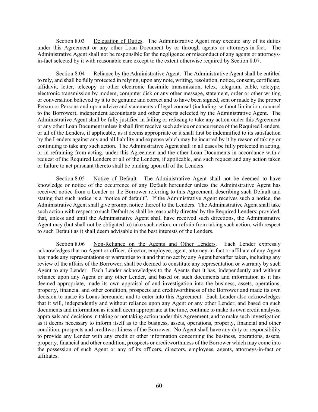 60 Section 8.03 Delegation of Duties. The Administrative Agent may execute any of its duties under this Agreement or any other Loan Document by or through agents or attorneys-in-fact. The Administrative Agent shall not be responsible for the negligence or misconduct of any agents or attorneys- in-fact selected by it with reasonable care except to the extent otherwise required by Section 8.07. Section 8.04 Reliance by the Administrative Agent. The Administrative Agent shall be entitled to rely, and shall be fully protected in relying, upon any note, writing, resolution, notice, consent, certificate, affidavit, letter, telecopy or other electronic facsimile transmission, telex, telegram, cable, teletype, electronic transmission by modem, computer disk or any other message, statement, order or other writing or conversation believed by it to be genuine and correct and to have been signed, sent or made by the proper Person or Persons and upon advice and statements of legal counsel (including, without limitation, counsel to the Borrower), independent accountants and other experts selected by the Administrative Agent. The Administrative Agent shall be fully justified in failing or refusing to take any action under this Agreement or any other Loan Document unless it shall first receive such advice or concurrence of the Required Lenders, or all of the Lenders, if applicable, as it deems appropriate or it shall first be indemnified to its satisfaction by the Lenders against any and all liability and expense which may be incurred by it by reason of taking or continuing to take any such action. The Administrative Agent shall in all cases be fully protected in acting, or in refraining from acting, under this Agreement and the other Loan Documents in accordance with a request of the Required Lenders or all of the Lenders, if applicable, and such request and any action taken or failure to act pursuant thereto shall be binding upon all of the Lenders. Section 8.05 Notice of Default. The Administrative Agent shall not be deemed to have knowledge or notice of the occurrence of any Default hereunder unless the Administrative Agent has received notice from a Lender or the Borrower referring to this Agreement, describing such Default and stating that such notice is a “notice of default”. If the Administrative Agent receives such a notice, the Administrative Agent shall give prompt notice thereof to the Lenders. The Administrative Agent shall take such action with respect to such Default as shall be reasonably directed by the Required Lenders; provided, that, unless and until the Administrative Agent shall have received such directions, the Administrative Agent may (but shall not be obligated to) take such action, or refrain from taking such action, with respect to such Default as it shall deem advisable in the best interests of the Lenders. Section 8.06 Non-Reliance on the Agents and Other Lenders. Each Lender expressly acknowledges that no Agent or officer, director, employee, agent, attorney-in-fact or affiliate of any Agent has made any representations or warranties to it and that no act by any Agent hereafter taken, including any review of the affairs of the Borrower, shall be deemed to constitute any representation or warranty by such Agent to any Lender. Each Lender acknowledges to the Agents that it has, independently and without reliance upon any Agent or any other Lender, and based on such documents and information as it has deemed appropriate, made its own appraisal of and investigation into the business, assets, operations, property, financial and other condition, prospects and creditworthiness of the Borrower and made its own decision to make its Loans hereunder and to enter into this Agreement. Each Lender also acknowledges that it will, independently and without reliance upon any Agent or any other Lender, and based on such documents and information as it shall deem appropriate at the time, continue to make its own credit analysis, appraisals and decisions in taking or not taking action under this Agreement, and to make such investigation as it deems necessary to inform itself as to the business, assets, operations, property, financial and other condition, prospects and creditworthiness of the Borrower. No Agent shall have any duty or responsibility to provide any Lender with any credit or other information concerning the business, operations, assets, property, financial and other condition, prospects or creditworthiness of the Borrower which may come into the possession of such Agent or any of its officers, directors, employees, agents, attorneys-in-fact or affiliates.