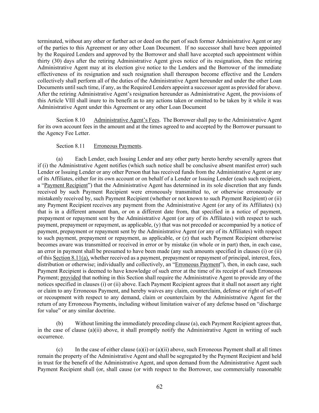 62 terminated, without any other or further act or deed on the part of such former Administrative Agent or any of the parties to this Agreement or any other Loan Document. If no successor shall have been appointed by the Required Lenders and approved by the Borrower and shall have accepted such appointment within thirty (30) days after the retiring Administrative Agent gives notice of its resignation, then the retiring Administrative Agent may at its election give notice to the Lenders and the Borrower of the immediate effectiveness of its resignation and such resignation shall thereupon become effective and the Lenders collectively shall perform all of the duties of the Administrative Agent hereunder and under the other Loan Documents until such time, if any, as the Required Lenders appoint a successor agent as provided for above. After the retiring Administrative Agent’s resignation hereunder as Administrative Agent, the provisions of this Article VIII shall inure to its benefit as to any actions taken or omitted to be taken by it while it was Administrative Agent under this Agreement or any other Loan Document Section 8.10 Administrative Agent’s Fees. The Borrower shall pay to the Administrative Agent for its own account fees in the amount and at the times agreed to and accepted by the Borrower pursuant to the Agency Fee Letter. Section 8.11 Erroneous Payments. (a) Each Lender, each Issuing Lender and any other party hereto hereby severally agrees that if (i) the Administrative Agent notifies (which such notice shall be conclusive absent manifest error) such Lender or Issuing Lender or any other Person that has received funds from the Administrative Agent or any of its Affiliates, either for its own account or on behalf of a Lender or Issuing Lender (each such recipient, a “Payment Recipient”) that the Administrative Agent has determined in its sole discretion that any funds received by such Payment Recipient were erroneously transmitted to, or otherwise erroneously or mistakenly received by, such Payment Recipient (whether or not known to such Payment Recipient) or (ii) any Payment Recipient receives any payment from the Administrative Agent (or any of its Affiliates) (x) that is in a different amount than, or on a different date from, that specified in a notice of payment, prepayment or repayment sent by the Administrative Agent (or any of its Affiliates) with respect to such payment, prepayment or repayment, as applicable, (y) that was not preceded or accompanied by a notice of payment, prepayment or repayment sent by the Administrative Agent (or any of its Affiliates) with respect to such payment, prepayment or repayment, as applicable, or (z) that such Payment Recipient otherwise becomes aware was transmitted or received in error or by mistake (in whole or in part) then, in each case, an error in payment shall be presumed to have been made (any such amounts specified in clauses (i) or (ii) of this Section 8.11(a), whether received as a payment, prepayment or repayment of principal, interest, fees, distribution or otherwise; individually and collectively, an “Erroneous Payment”), then, in each case, such Payment Recipient is deemed to have knowledge of such error at the time of its receipt of such Erroneous Payment; provided that nothing in this Section shall require the Administrative Agent to provide any of the notices specified in clauses (i) or (ii) above. Each Payment Recipient agrees that it shall not assert any right or claim to any Erroneous Payment, and hereby waives any claim, counterclaim, defense or right of set-off or recoupment with respect to any demand, claim or counterclaim by the Administrative Agent for the return of any Erroneous Payments, including without limitation waiver of any defense based on “discharge for value” or any similar doctrine. (b) Without limiting the immediately preceding clause (a), each Payment Recipient agrees that, in the case of clause (a)(ii) above, it shall promptly notify the Administrative Agent in writing of such occurrence. (c) In the case of either clause (a)(i) or (a)(ii) above, such Erroneous Payment shall at all times remain the property of the Administrative Agent and shall be segregated by the Payment Recipient and held in trust for the benefit of the Administrative Agent, and upon demand from the Administrative Agent such Payment Recipient shall (or, shall cause (or with respect to the Borrower, use commercially reasonable