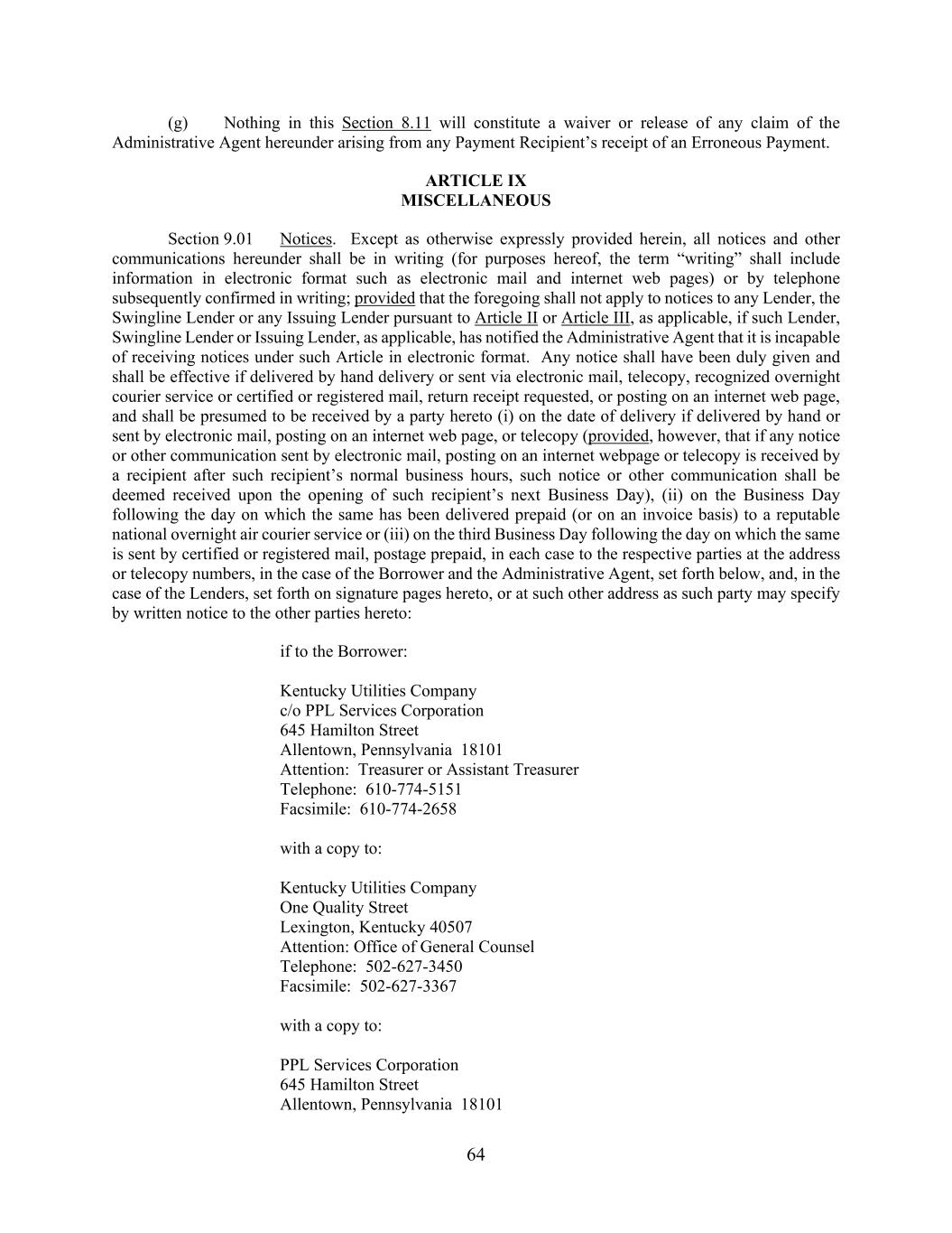 64 (g) Nothing in this Section 8.11 will constitute a waiver or release of any claim of the Administrative Agent hereunder arising from any Payment Recipient’s receipt of an Erroneous Payment. ARTICLE IX MISCELLANEOUS Section 9.01 Notices. Except as otherwise expressly provided herein, all notices and other communications hereunder shall be in writing (for purposes hereof, the term “writing” shall include information in electronic format such as electronic mail and internet web pages) or by telephone subsequently confirmed in writing; provided that the foregoing shall not apply to notices to any Lender, the Swingline Lender or any Issuing Lender pursuant to Article II or Article III, as applicable, if such Lender, Swingline Lender or Issuing Lender, as applicable, has notified the Administrative Agent that it is incapable of receiving notices under such Article in electronic format. Any notice shall have been duly given and shall be effective if delivered by hand delivery or sent via electronic mail, telecopy, recognized overnight courier service or certified or registered mail, return receipt requested, or posting on an internet web page, and shall be presumed to be received by a party hereto (i) on the date of delivery if delivered by hand or sent by electronic mail, posting on an internet web page, or telecopy (provided, however, that if any notice or other communication sent by electronic mail, posting on an internet webpage or telecopy is received by a recipient after such recipient’s normal business hours, such notice or other communication shall be deemed received upon the opening of such recipient’s next Business Day), (ii) on the Business Day following the day on which the same has been delivered prepaid (or on an invoice basis) to a reputable national overnight air courier service or (iii) on the third Business Day following the day on which the same is sent by certified or registered mail, postage prepaid, in each case to the respective parties at the address or telecopy numbers, in the case of the Borrower and the Administrative Agent, set forth below, and, in the case of the Lenders, set forth on signature pages hereto, or at such other address as such party may specify by written notice to the other parties hereto: if to the Borrower: Kentucky Utilities Company c/o PPL Services Corporation 645 Hamilton Street Allentown, Pennsylvania 18101 Attention: Treasurer or Assistant Treasurer Telephone: 610-774-5151 Facsimile: 610-774-2658 with a copy to: Kentucky Utilities Company One Quality Street Lexington, Kentucky 40507 Attention: Office of General Counsel Telephone: 502-627-3450 Facsimile: 502-627-3367 with a copy to: PPL Services Corporation 645 Hamilton Street Allentown, Pennsylvania 18101