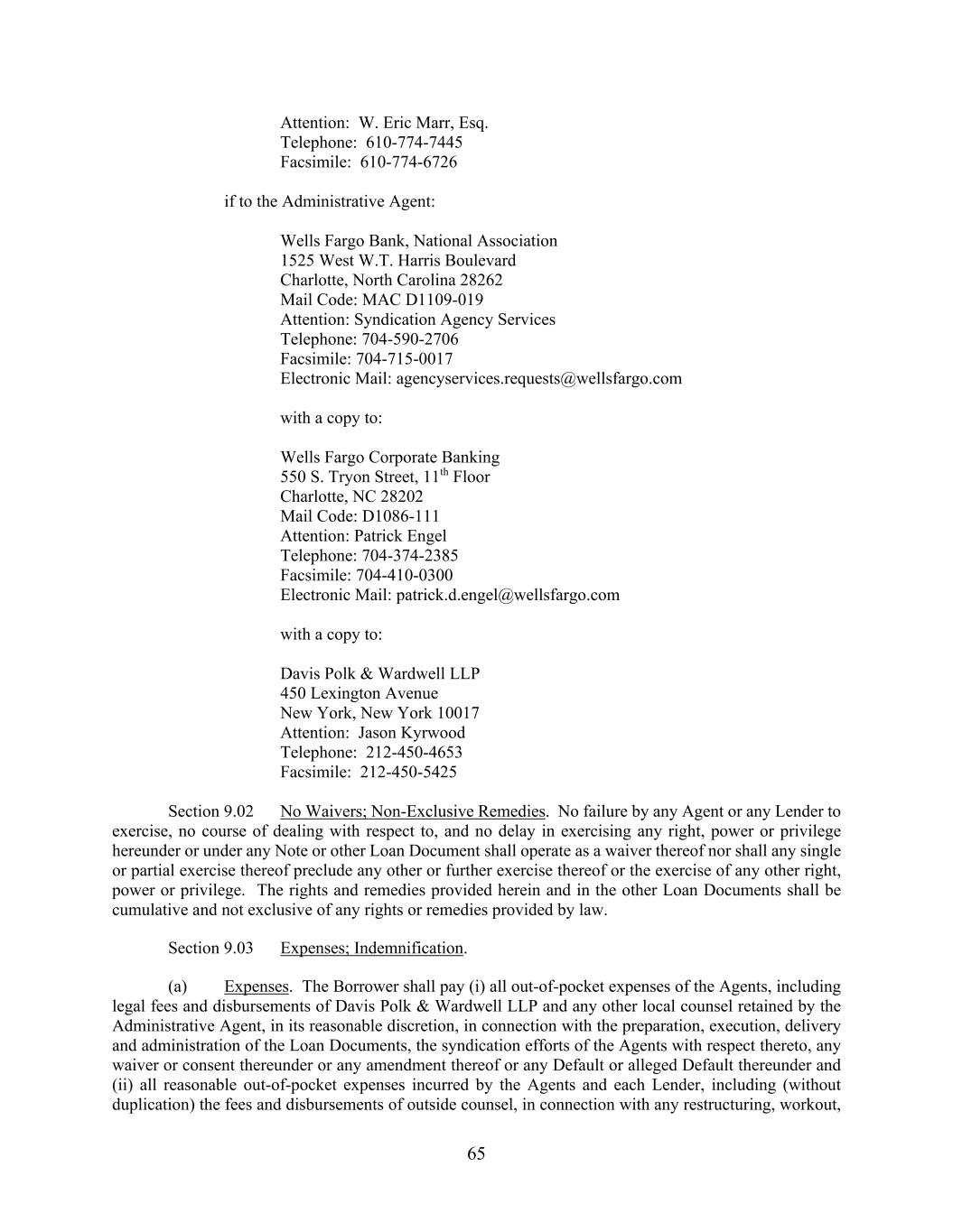 65 Attention: W. Eric Marr, Esq. Telephone: 610-774-7445 Facsimile: 610-774-6726 if to the Administrative Agent: Wells Fargo Bank, National Association 1525 West W.T. Harris Boulevard Charlotte, North Carolina 28262 Mail Code: MAC D1109-019 Attention: Syndication Agency Services Telephone: 704-590-2706 Facsimile: 704-715-0017 Electronic Mail: agencyservices.requests@wellsfargo.com with a copy to: Wells Fargo Corporate Banking 550 S. Tryon Street, 11th Floor Charlotte, NC 28202 Mail Code: D1086-111 Attention: Patrick Engel Telephone: 704-374-2385 Facsimile: 704-410-0300 Electronic Mail: patrick.d.engel@wellsfargo.com with a copy to: Davis Polk & Wardwell LLP 450 Lexington Avenue New York, New York 10017 Attention: Jason Kyrwood Telephone: 212-450-4653 Facsimile: 212-450-5425 Section 9.02 No Waivers; Non-Exclusive Remedies. No failure by any Agent or any Lender to exercise, no course of dealing with respect to, and no delay in exercising any right, power or privilege hereunder or under any Note or other Loan Document shall operate as a waiver thereof nor shall any single or partial exercise thereof preclude any other or further exercise thereof or the exercise of any other right, power or privilege. The rights and remedies provided herein and in the other Loan Documents shall be cumulative and not exclusive of any rights or remedies provided by law. Section 9.03 Expenses; Indemnification. (a) Expenses. The Borrower shall pay (i) all out-of-pocket expenses of the Agents, including legal fees and disbursements of Davis Polk & Wardwell LLP and any other local counsel retained by the Administrative Agent, in its reasonable discretion, in connection with the preparation, execution, delivery and administration of the Loan Documents, the syndication efforts of the Agents with respect thereto, any waiver or consent thereunder or any amendment thereof or any Default or alleged Default thereunder and (ii) all reasonable out-of-pocket expenses incurred by the Agents and each Lender, including (without duplication) the fees and disbursements of outside counsel, in connection with any restructuring, workout,