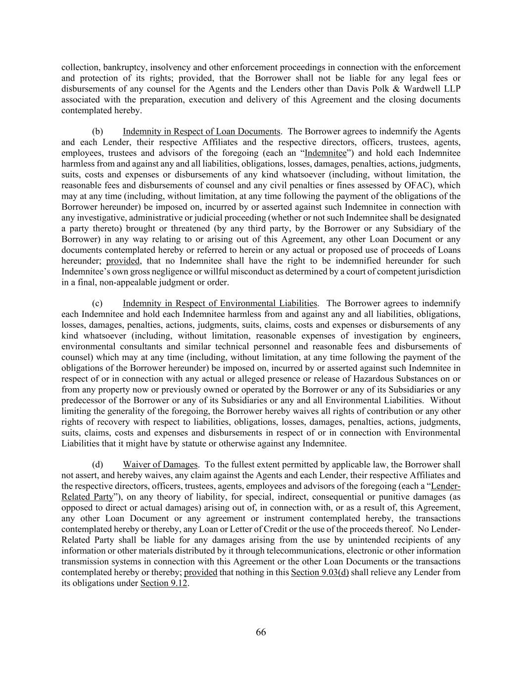 66 collection, bankruptcy, insolvency and other enforcement proceedings in connection with the enforcement and protection of its rights; provided, that the Borrower shall not be liable for any legal fees or disbursements of any counsel for the Agents and the Lenders other than Davis Polk & Wardwell LLP associated with the preparation, execution and delivery of this Agreement and the closing documents contemplated hereby. (b) Indemnity in Respect of Loan Documents. The Borrower agrees to indemnify the Agents and each Lender, their respective Affiliates and the respective directors, officers, trustees, agents, employees, trustees and advisors of the foregoing (each an “Indemnitee”) and hold each Indemnitee harmless from and against any and all liabilities, obligations, losses, damages, penalties, actions, judgments, suits, costs and expenses or disbursements of any kind whatsoever (including, without limitation, the reasonable fees and disbursements of counsel and any civil penalties or fines assessed by OFAC), which may at any time (including, without limitation, at any time following the payment of the obligations of the Borrower hereunder) be imposed on, incurred by or asserted against such Indemnitee in connection with any investigative, administrative or judicial proceeding (whether or not such Indemnitee shall be designated a party thereto) brought or threatened (by any third party, by the Borrower or any Subsidiary of the Borrower) in any way relating to or arising out of this Agreement, any other Loan Document or any documents contemplated hereby or referred to herein or any actual or proposed use of proceeds of Loans hereunder; provided, that no Indemnitee shall have the right to be indemnified hereunder for such Indemnitee’s own gross negligence or willful misconduct as determined by a court of competent jurisdiction in a final, non-appealable judgment or order. (c) Indemnity in Respect of Environmental Liabilities. The Borrower agrees to indemnify each Indemnitee and hold each Indemnitee harmless from and against any and all liabilities, obligations, losses, damages, penalties, actions, judgments, suits, claims, costs and expenses or disbursements of any kind whatsoever (including, without limitation, reasonable expenses of investigation by engineers, environmental consultants and similar technical personnel and reasonable fees and disbursements of counsel) which may at any time (including, without limitation, at any time following the payment of the obligations of the Borrower hereunder) be imposed on, incurred by or asserted against such Indemnitee in respect of or in connection with any actual or alleged presence or release of Hazardous Substances on or from any property now or previously owned or operated by the Borrower or any of its Subsidiaries or any predecessor of the Borrower or any of its Subsidiaries or any and all Environmental Liabilities. Without limiting the generality of the foregoing, the Borrower hereby waives all rights of contribution or any other rights of recovery with respect to liabilities, obligations, losses, damages, penalties, actions, judgments, suits, claims, costs and expenses and disbursements in respect of or in connection with Environmental Liabilities that it might have by statute or otherwise against any Indemnitee. (d) Waiver of Damages. To the fullest extent permitted by applicable law, the Borrower shall not assert, and hereby waives, any claim against the Agents and each Lender, their respective Affiliates and the respective directors, officers, trustees, agents, employees and advisors of the foregoing (each a “Lender- Related Party”), on any theory of liability, for special, indirect, consequential or punitive damages (as opposed to direct or actual damages) arising out of, in connection with, or as a result of, this Agreement, any other Loan Document or any agreement or instrument contemplated hereby, the transactions contemplated hereby or thereby, any Loan or Letter of Credit or the use of the proceeds thereof. No Lender- Related Party shall be liable for any damages arising from the use by unintended recipients of any information or other materials distributed by it through telecommunications, electronic or other information transmission systems in connection with this Agreement or the other Loan Documents or the transactions contemplated hereby or thereby; provided that nothing in this Section 9.03(d) shall relieve any Lender from its obligations under Section 9.12.