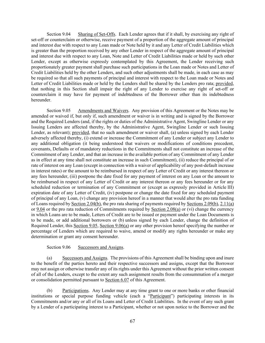 67 Section 9.04 Sharing of Set-Offs. Each Lender agrees that if it shall, by exercising any right of set-off or counterclaim or otherwise, receive payment of a proportion of the aggregate amount of principal and interest due with respect to any Loan made or Note held by it and any Letter of Credit Liabilities which is greater than the proportion received by any other Lender in respect of the aggregate amount of principal and interest due with respect to any Loan, Note and Letter of Credit Liabilities made or held by such other Lender, except as otherwise expressly contemplated by this Agreement, the Lender receiving such proportionately greater payment shall purchase such participations in the Loan made or Notes and Letter of Credit Liabilities held by the other Lenders, and such other adjustments shall be made, in each case as may be required so that all such payments of principal and interest with respect to the Loan made or Notes and Letter of Credit Liabilities made or held by the Lenders shall be shared by the Lenders pro rata; provided, that nothing in this Section shall impair the right of any Lender to exercise any right of set-off or counterclaim it may have for payment of indebtedness of the Borrower other than its indebtedness hereunder. Section 9.05 Amendments and Waivers. Any provision of this Agreement or the Notes may be amended or waived if, but only if, such amendment or waiver is in writing and is signed by the Borrower and the Required Lenders (and, if the rights or duties of the Administrative Agent, Swingline Lender or any Issuing Lenders are affected thereby, by the Administrative Agent, Swingline Lender or such Issuing Lender, as relevant); provided, that no such amendment or waiver shall, (a) unless signed by each Lender adversely affected thereby, (i) extend or increase the Commitment of any Lender or subject any Lender to any additional obligation (it being understood that waivers or modifications of conditions precedent, covenants, Defaults or of mandatory reductions in the Commitments shall not constitute an increase of the Commitment of any Lender, and that an increase in the available portion of any Commitment of any Lender as in effect at any time shall not constitute an increase in such Commitment), (ii) reduce the principal of or rate of interest on any Loan (except in connection with a waiver of applicability of any post-default increase in interest rates) or the amount to be reimbursed in respect of any Letter of Credit or any interest thereon or any fees hereunder, (iii) postpone the date fixed for any payment of interest on any Loan or the amount to be reimbursed in respect of any Letter of Credit or any interest thereon or any fees hereunder or for any scheduled reduction or termination of any Commitment or (except as expressly provided in Article III) expiration date of any Letter of Credit, (iv) postpone or change the date fixed for any scheduled payment of principal of any Loan, (v) change any provision hereof in a manner that would alter the pro rata funding of Loans required by Section 2.04(b), the pro rata sharing of payments required by Sections 2.09(b), 2.11(a) or 9.04 or the pro rata reduction of Commitments required by Section 2.08(a) or (vi) change the currency in which Loans are to be made, Letters of Credit are to be issued or payment under the Loan Documents is to be made, or add additional borrowers or (b) unless signed by each Lender, change the definition of Required Lender, this Section 9.05, Section 9.06(a) or any other provision hereof specifying the number or percentage of Lenders which are required to waive, amend or modify any rights hereunder or make any determination or grant any consent hereunder. Section 9.06 Successors and Assigns. (a) Successors and Assigns. The provisions of this Agreement shall be binding upon and inure to the benefit of the parties hereto and their respective successors and assigns, except that the Borrower may not assign or otherwise transfer any of its rights under this Agreement without the prior written consent of all of the Lenders, except to the extent any such assignment results from the consummation of a merger or consolidation permitted pursuant to Section 6.07 of this Agreement. (b) Participations. Any Lender may at any time grant to one or more banks or other financial institutions or special purpose funding vehicle (each a “Participant”) participating interests in its Commitments and/or any or all of its Loans and Letter of Credit Liabilities. In the event of any such grant by a Lender of a participating interest to a Participant, whether or not upon notice to the Borrower and the