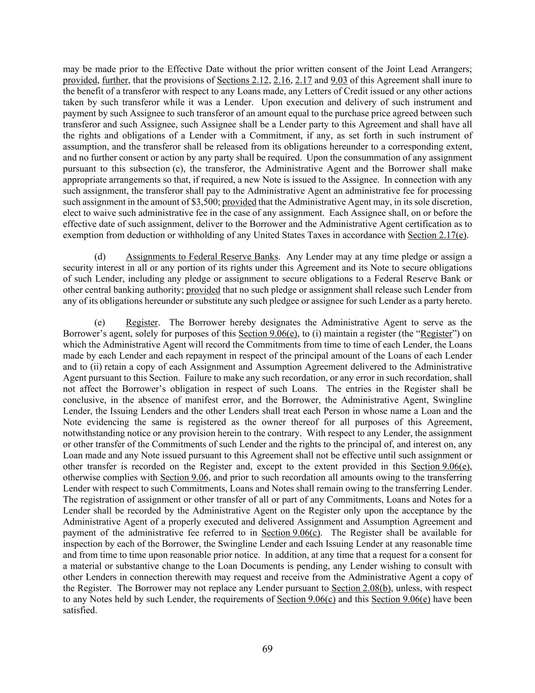 69 may be made prior to the Effective Date without the prior written consent of the Joint Lead Arrangers; provided, further, that the provisions of Sections 2.12, 2.16, 2.17 and 9.03 of this Agreement shall inure to the benefit of a transferor with respect to any Loans made, any Letters of Credit issued or any other actions taken by such transferor while it was a Lender. Upon execution and delivery of such instrument and payment by such Assignee to such transferor of an amount equal to the purchase price agreed between such transferor and such Assignee, such Assignee shall be a Lender party to this Agreement and shall have all the rights and obligations of a Lender with a Commitment, if any, as set forth in such instrument of assumption, and the transferor shall be released from its obligations hereunder to a corresponding extent, and no further consent or action by any party shall be required. Upon the consummation of any assignment pursuant to this subsection (c), the transferor, the Administrative Agent and the Borrower shall make appropriate arrangements so that, if required, a new Note is issued to the Assignee. In connection with any such assignment, the transferor shall pay to the Administrative Agent an administrative fee for processing such assignment in the amount of $3,500; provided that the Administrative Agent may, in its sole discretion, elect to waive such administrative fee in the case of any assignment. Each Assignee shall, on or before the effective date of such assignment, deliver to the Borrower and the Administrative Agent certification as to exemption from deduction or withholding of any United States Taxes in accordance with Section 2.17(e). (d) Assignments to Federal Reserve Banks. Any Lender may at any time pledge or assign a security interest in all or any portion of its rights under this Agreement and its Note to secure obligations of such Lender, including any pledge or assignment to secure obligations to a Federal Reserve Bank or other central banking authority; provided that no such pledge or assignment shall release such Lender from any of its obligations hereunder or substitute any such pledgee or assignee for such Lender as a party hereto. (e) Register. The Borrower hereby designates the Administrative Agent to serve as the Borrower’s agent, solely for purposes of this Section 9.06(e), to (i) maintain a register (the “Register”) on which the Administrative Agent will record the Commitments from time to time of each Lender, the Loans made by each Lender and each repayment in respect of the principal amount of the Loans of each Lender and to (ii) retain a copy of each Assignment and Assumption Agreement delivered to the Administrative Agent pursuant to this Section. Failure to make any such recordation, or any error in such recordation, shall not affect the Borrower’s obligation in respect of such Loans. The entries in the Register shall be conclusive, in the absence of manifest error, and the Borrower, the Administrative Agent, Swingline Lender, the Issuing Lenders and the other Lenders shall treat each Person in whose name a Loan and the Note evidencing the same is registered as the owner thereof for all purposes of this Agreement, notwithstanding notice or any provision herein to the contrary. With respect to any Lender, the assignment or other transfer of the Commitments of such Lender and the rights to the principal of, and interest on, any Loan made and any Note issued pursuant to this Agreement shall not be effective until such assignment or other transfer is recorded on the Register and, except to the extent provided in this Section 9.06(e), otherwise complies with Section 9.06, and prior to such recordation all amounts owing to the transferring Lender with respect to such Commitments, Loans and Notes shall remain owing to the transferring Lender. The registration of assignment or other transfer of all or part of any Commitments, Loans and Notes for a Lender shall be recorded by the Administrative Agent on the Register only upon the acceptance by the Administrative Agent of a properly executed and delivered Assignment and Assumption Agreement and payment of the administrative fee referred to in Section 9.06(c). The Register shall be available for inspection by each of the Borrower, the Swingline Lender and each Issuing Lender at any reasonable time and from time to time upon reasonable prior notice. In addition, at any time that a request for a consent for a material or substantive change to the Loan Documents is pending, any Lender wishing to consult with other Lenders in connection therewith may request and receive from the Administrative Agent a copy of the Register. The Borrower may not replace any Lender pursuant to Section 2.08(b), unless, with respect to any Notes held by such Lender, the requirements of Section 9.06(c) and this Section 9.06(e) have been satisfied.