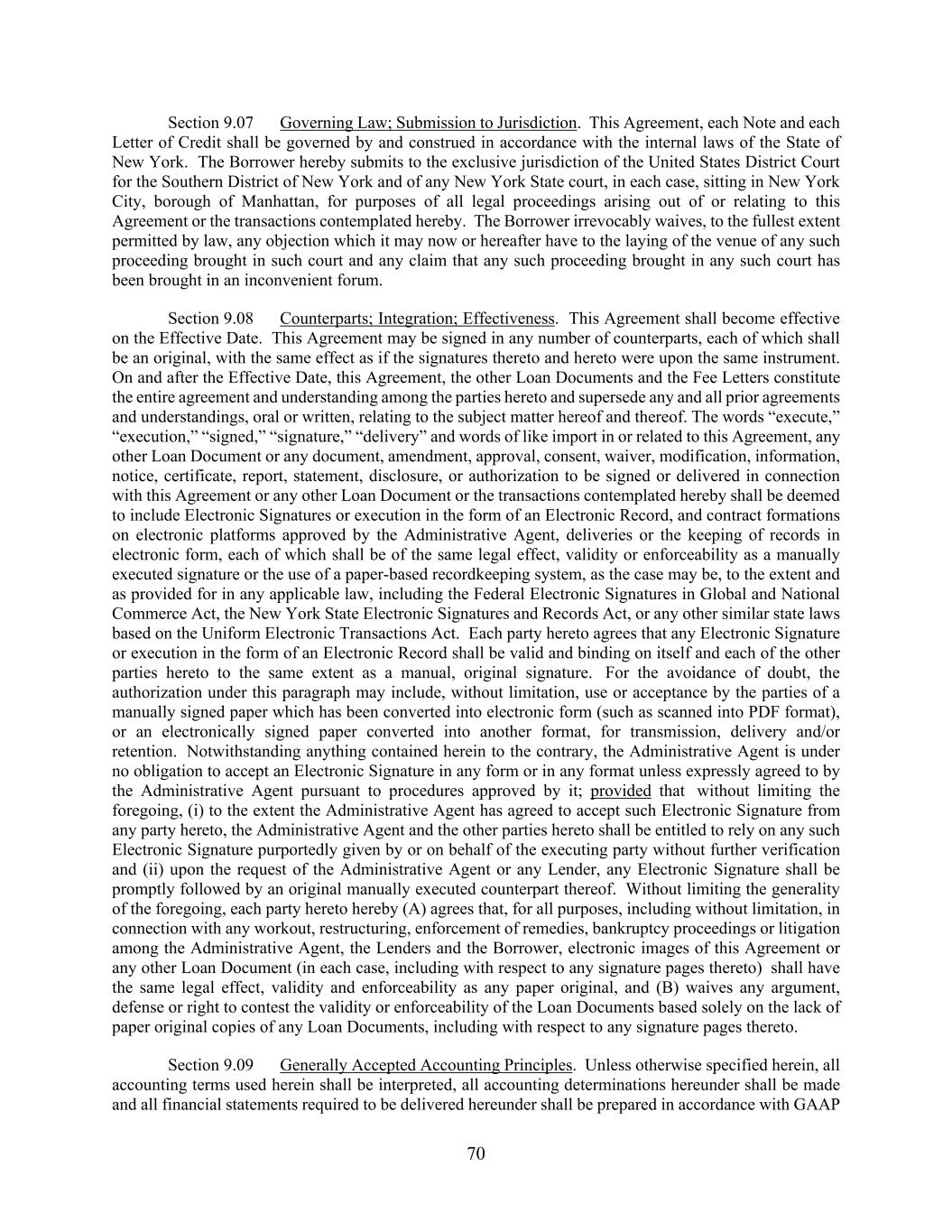 70 Section 9.07 Governing Law; Submission to Jurisdiction. This Agreement, each Note and each Letter of Credit shall be governed by and construed in accordance with the internal laws of the State of New York. The Borrower hereby submits to the exclusive jurisdiction of the United States District Court for the Southern District of New York and of any New York State court, in each case, sitting in New York City, borough of Manhattan, for purposes of all legal proceedings arising out of or relating to this Agreement or the transactions contemplated hereby. The Borrower irrevocably waives, to the fullest extent permitted by law, any objection which it may now or hereafter have to the laying of the venue of any such proceeding brought in such court and any claim that any such proceeding brought in any such court has been brought in an inconvenient forum. Section 9.08 Counterparts; Integration; Effectiveness. This Agreement shall become effective on the Effective Date. This Agreement may be signed in any number of counterparts, each of which shall be an original, with the same effect as if the signatures thereto and hereto were upon the same instrument. On and after the Effective Date, this Agreement, the other Loan Documents and the Fee Letters constitute the entire agreement and understanding among the parties hereto and supersede any and all prior agreements and understandings, oral or written, relating to the subject matter hereof and thereof. The words “execute,” “execution,” “signed,” “signature,” “delivery” and words of like import in or related to this Agreement, any other Loan Document or any document, amendment, approval, consent, waiver, modification, information, notice, certificate, report, statement, disclosure, or authorization to be signed or delivered in connection with this Agreement or any other Loan Document or the transactions contemplated hereby shall be deemed to include Electronic Signatures or execution in the form of an Electronic Record, and contract formations on electronic platforms approved by the Administrative Agent, deliveries or the keeping of records in electronic form, each of which shall be of the same legal effect, validity or enforceability as a manually executed signature or the use of a paper-based recordkeeping system, as the case may be, to the extent and as provided for in any applicable law, including the Federal Electronic Signatures in Global and National Commerce Act, the New York State Electronic Signatures and Records Act, or any other similar state laws based on the Uniform Electronic Transactions Act. Each party hereto agrees that any Electronic Signature or execution in the form of an Electronic Record shall be valid and binding on itself and each of the other parties hereto to the same extent as a manual, original signature. For the avoidance of doubt, the authorization under this paragraph may include, without limitation, use or acceptance by the parties of a manually signed paper which has been converted into electronic form (such as scanned into PDF format), or an electronically signed paper converted into another format, for transmission, delivery and/or retention. Notwithstanding anything contained herein to the contrary, the Administrative Agent is under no obligation to accept an Electronic Signature in any form or in any format unless expressly agreed to by the Administrative Agent pursuant to procedures approved by it; provided that without limiting the foregoing, (i) to the extent the Administrative Agent has agreed to accept such Electronic Signature from any party hereto, the Administrative Agent and the other parties hereto shall be entitled to rely on any such Electronic Signature purportedly given by or on behalf of the executing party without further verification and (ii) upon the request of the Administrative Agent or any Lender, any Electronic Signature shall be promptly followed by an original manually executed counterpart thereof. Without limiting the generality of the foregoing, each party hereto hereby (A) agrees that, for all purposes, including without limitation, in connection with any workout, restructuring, enforcement of remedies, bankruptcy proceedings or litigation among the Administrative Agent, the Lenders and the Borrower, electronic images of this Agreement or any other Loan Document (in each case, including with respect to any signature pages thereto) shall have the same legal effect, validity and enforceability as any paper original, and (B) waives any argument, defense or right to contest the validity or enforceability of the Loan Documents based solely on the lack of paper original copies of any Loan Documents, including with respect to any signature pages thereto. Section 9.09 Generally Accepted Accounting Principles. Unless otherwise specified herein, all accounting terms used herein shall be interpreted, all accounting determinations hereunder shall be made and all financial statements required to be delivered hereunder shall be prepared in accordance with GAAP