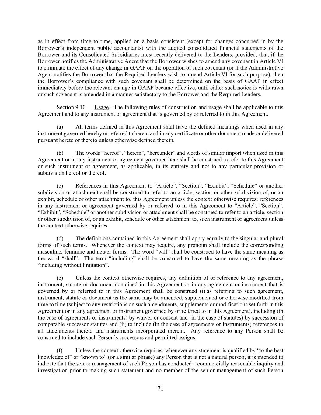 71 as in effect from time to time, applied on a basis consistent (except for changes concurred in by the Borrower’s independent public accountants) with the audited consolidated financial statements of the Borrower and its Consolidated Subsidiaries most recently delivered to the Lenders; provided, that, if the Borrower notifies the Administrative Agent that the Borrower wishes to amend any covenant in Article VI to eliminate the effect of any change in GAAP on the operation of such covenant (or if the Administrative Agent notifies the Borrower that the Required Lenders wish to amend Article VI for such purpose), then the Borrower’s compliance with such covenant shall be determined on the basis of GAAP in effect immediately before the relevant change in GAAP became effective, until either such notice is withdrawn or such covenant is amended in a manner satisfactory to the Borrower and the Required Lenders. Section 9.10 Usage. The following rules of construction and usage shall be applicable to this Agreement and to any instrument or agreement that is governed by or referred to in this Agreement. (a) All terms defined in this Agreement shall have the defined meanings when used in any instrument governed hereby or referred to herein and in any certificate or other document made or delivered pursuant hereto or thereto unless otherwise defined therein. (b) The words “hereof”, “herein”, “hereunder” and words of similar import when used in this Agreement or in any instrument or agreement governed here shall be construed to refer to this Agreement or such instrument or agreement, as applicable, in its entirety and not to any particular provision or subdivision hereof or thereof. (c) References in this Agreement to “Article”, “Section”, “Exhibit”, “Schedule” or another subdivision or attachment shall be construed to refer to an article, section or other subdivision of, or an exhibit, schedule or other attachment to, this Agreement unless the context otherwise requires; references in any instrument or agreement governed by or referred to in this Agreement to “Article”, “Section”, “Exhibit”, “Schedule” or another subdivision or attachment shall be construed to refer to an article, section or other subdivision of, or an exhibit, schedule or other attachment to, such instrument or agreement unless the context otherwise requires. (d) The definitions contained in this Agreement shall apply equally to the singular and plural forms of such terms. Whenever the context may require, any pronoun shall include the corresponding masculine, feminine and neuter forms. The word “will” shall be construed to have the same meaning as the word “shall”. The term “including” shall be construed to have the same meaning as the phrase “including without limitation”. (e) Unless the context otherwise requires, any definition of or reference to any agreement, instrument, statute or document contained in this Agreement or in any agreement or instrument that is governed by or referred to in this Agreement shall be construed (i) as referring to such agreement, instrument, statute or document as the same may be amended, supplemented or otherwise modified from time to time (subject to any restrictions on such amendments, supplements or modifications set forth in this Agreement or in any agreement or instrument governed by or referred to in this Agreement), including (in the case of agreements or instruments) by waiver or consent and (in the case of statutes) by succession of comparable successor statutes and (ii) to include (in the case of agreements or instruments) references to all attachments thereto and instruments incorporated therein. Any reference to any Person shall be construed to include such Person’s successors and permitted assigns. (f) Unless the context otherwise requires, whenever any statement is qualified by “to the best knowledge of” or “known to” (or a similar phrase) any Person that is not a natural person, it is intended to indicate that the senior management of such Person has conducted a commercially reasonable inquiry and investigation prior to making such statement and no member of the senior management of such Person