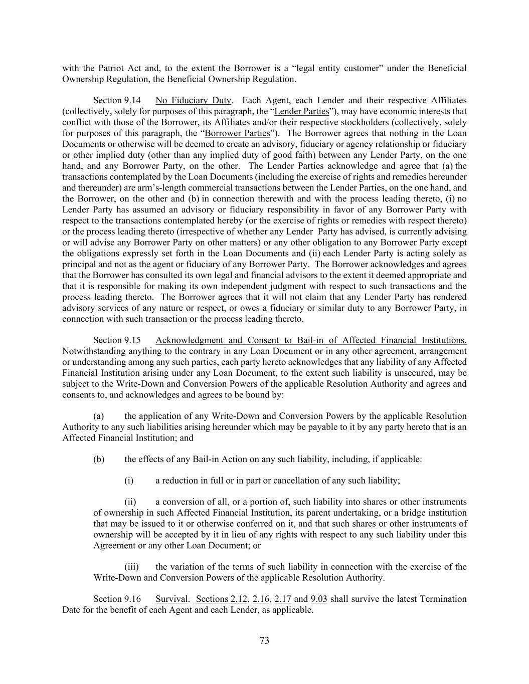 73 with the Patriot Act and, to the extent the Borrower is a “legal entity customer” under the Beneficial Ownership Regulation, the Beneficial Ownership Regulation. Section 9.14 No Fiduciary Duty. Each Agent, each Lender and their respective Affiliates (collectively, solely for purposes of this paragraph, the “Lender Parties”), may have economic interests that conflict with those of the Borrower, its Affiliates and/or their respective stockholders (collectively, solely for purposes of this paragraph, the “Borrower Parties”). The Borrower agrees that nothing in the Loan Documents or otherwise will be deemed to create an advisory, fiduciary or agency relationship or fiduciary or other implied duty (other than any implied duty of good faith) between any Lender Party, on the one hand, and any Borrower Party, on the other. The Lender Parties acknowledge and agree that (a) the transactions contemplated by the Loan Documents (including the exercise of rights and remedies hereunder and thereunder) are arm’s-length commercial transactions between the Lender Parties, on the one hand, and the Borrower, on the other and (b) in connection therewith and with the process leading thereto, (i) no Lender Party has assumed an advisory or fiduciary responsibility in favor of any Borrower Party with respect to the transactions contemplated hereby (or the exercise of rights or remedies with respect thereto) or the process leading thereto (irrespective of whether any Lender Party has advised, is currently advising or will advise any Borrower Party on other matters) or any other obligation to any Borrower Party except the obligations expressly set forth in the Loan Documents and (ii) each Lender Party is acting solely as principal and not as the agent or fiduciary of any Borrower Party. The Borrower acknowledges and agrees that the Borrower has consulted its own legal and financial advisors to the extent it deemed appropriate and that it is responsible for making its own independent judgment with respect to such transactions and the process leading thereto. The Borrower agrees that it will not claim that any Lender Party has rendered advisory services of any nature or respect, or owes a fiduciary or similar duty to any Borrower Party, in connection with such transaction or the process leading thereto. Section 9.15 Acknowledgment and Consent to Bail-in of Affected Financial Institutions. Notwithstanding anything to the contrary in any Loan Document or in any other agreement, arrangement or understanding among any such parties, each party hereto acknowledges that any liability of any Affected Financial Institution arising under any Loan Document, to the extent such liability is unsecured, may be subject to the Write-Down and Conversion Powers of the applicable Resolution Authority and agrees and consents to, and acknowledges and agrees to be bound by: (a) the application of any Write-Down and Conversion Powers by the applicable Resolution Authority to any such liabilities arising hereunder which may be payable to it by any party hereto that is an Affected Financial Institution; and (b) the effects of any Bail-in Action on any such liability, including, if applicable: (i) a reduction in full or in part or cancellation of any such liability; (ii) a conversion of all, or a portion of, such liability into shares or other instruments of ownership in such Affected Financial Institution, its parent undertaking, or a bridge institution that may be issued to it or otherwise conferred on it, and that such shares or other instruments of ownership will be accepted by it in lieu of any rights with respect to any such liability under this Agreement or any other Loan Document; or (iii) the variation of the terms of such liability in connection with the exercise of the Write-Down and Conversion Powers of the applicable Resolution Authority. Section 9.16 Survival. Sections 2.12, 2.16, 2.17 and 9.03 shall survive the latest Termination Date for the benefit of each Agent and each Lender, as applicable.