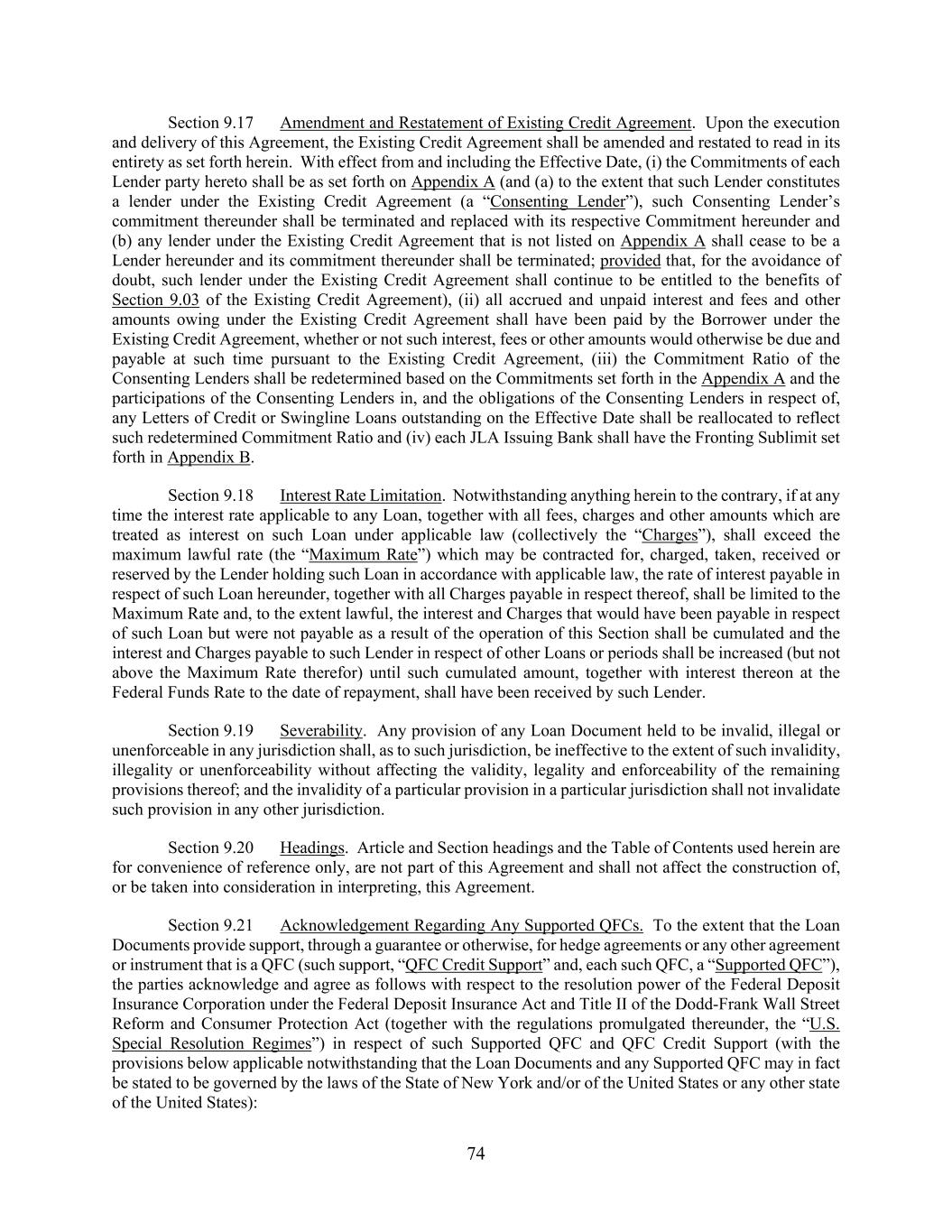 74 Section 9.17 Amendment and Restatement of Existing Credit Agreement. Upon the execution and delivery of this Agreement, the Existing Credit Agreement shall be amended and restated to read in its entirety as set forth herein. With effect from and including the Effective Date, (i) the Commitments of each Lender party hereto shall be as set forth on Appendix A (and (a) to the extent that such Lender constitutes a lender under the Existing Credit Agreement (a “Consenting Lender”), such Consenting Lender’s commitment thereunder shall be terminated and replaced with its respective Commitment hereunder and (b) any lender under the Existing Credit Agreement that is not listed on Appendix A shall cease to be a Lender hereunder and its commitment thereunder shall be terminated; provided that, for the avoidance of doubt, such lender under the Existing Credit Agreement shall continue to be entitled to the benefits of Section 9.03 of the Existing Credit Agreement), (ii) all accrued and unpaid interest and fees and other amounts owing under the Existing Credit Agreement shall have been paid by the Borrower under the Existing Credit Agreement, whether or not such interest, fees or other amounts would otherwise be due and payable at such time pursuant to the Existing Credit Agreement, (iii) the Commitment Ratio of the Consenting Lenders shall be redetermined based on the Commitments set forth in the Appendix A and the participations of the Consenting Lenders in, and the obligations of the Consenting Lenders in respect of, any Letters of Credit or Swingline Loans outstanding on the Effective Date shall be reallocated to reflect such redetermined Commitment Ratio and (iv) each JLA Issuing Bank shall have the Fronting Sublimit set forth in Appendix B. Section 9.18 Interest Rate Limitation. Notwithstanding anything herein to the contrary, if at any time the interest rate applicable to any Loan, together with all fees, charges and other amounts which are treated as interest on such Loan under applicable law (collectively the “Charges”), shall exceed the maximum lawful rate (the “Maximum Rate”) which may be contracted for, charged, taken, received or reserved by the Lender holding such Loan in accordance with applicable law, the rate of interest payable in respect of such Loan hereunder, together with all Charges payable in respect thereof, shall be limited to the Maximum Rate and, to the extent lawful, the interest and Charges that would have been payable in respect of such Loan but were not payable as a result of the operation of this Section shall be cumulated and the interest and Charges payable to such Lender in respect of other Loans or periods shall be increased (but not above the Maximum Rate therefor) until such cumulated amount, together with interest thereon at the Federal Funds Rate to the date of repayment, shall have been received by such Lender. Section 9.19 Severability. Any provision of any Loan Document held to be invalid, illegal or unenforceable in any jurisdiction shall, as to such jurisdiction, be ineffective to the extent of such invalidity, illegality or unenforceability without affecting the validity, legality and enforceability of the remaining provisions thereof; and the invalidity of a particular provision in a particular jurisdiction shall not invalidate such provision in any other jurisdiction. Section 9.20 Headings. Article and Section headings and the Table of Contents used herein are for convenience of reference only, are not part of this Agreement and shall not affect the construction of, or be taken into consideration in interpreting, this Agreement. Section 9.21 Acknowledgement Regarding Any Supported QFCs. To the extent that the Loan Documents provide support, through a guarantee or otherwise, for hedge agreements or any other agreement or instrument that is a QFC (such support, “QFC Credit Support” and, each such QFC, a “Supported QFC”), the parties acknowledge and agree as follows with respect to the resolution power of the Federal Deposit Insurance Corporation under the Federal Deposit Insurance Act and Title II of the Dodd-Frank Wall Street Reform and Consumer Protection Act (together with the regulations promulgated thereunder, the “U.S. Special Resolution Regimes”) in respect of such Supported QFC and QFC Credit Support (with the provisions below applicable notwithstanding that the Loan Documents and any Supported QFC may in fact be stated to be governed by the laws of the State of New York and/or of the United States or any other state of the United States):