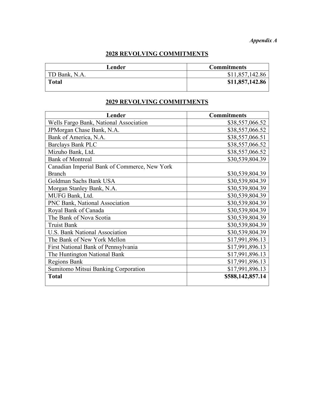 Appendix A 2028 REVOLVING COMMITMENTS Lender Commitments TD Bank, N.A. $11,857,142.86 Total $11,857,142.86 2029 REVOLVING COMMITMENTS Lender Commitments Wells Fargo Bank, National Association $38,557,066.52 JPMorgan Chase Bank, N.A. $38,557,066.52 Bank of America, N.A. $38,557,066.51 Barclays Bank PLC $38,557,066.52 Mizuho Bank, Ltd. $38,557,066.52 Bank of Montreal $30,539,804.39 Canadian Imperial Bank of Commerce, New York Branch $30,539,804.39 Goldman Sachs Bank USA $30,539,804.39 Morgan Stanley Bank, N.A. $30,539,804.39 MUFG Bank, Ltd. $30,539,804.39 PNC Bank, National Association $30,539,804.39 Royal Bank of Canada $30,539,804.39 The Bank of Nova Scotia $30,539,804.39 Truist Bank $30,539,804.39 U.S. Bank National Association $30,539,804.39 The Bank of New York Mellon $17,991,896.13 First National Bank of Pennsylvania $17,991,896.13 The Huntington National Bank $17,991,896.13 Regions Bank $17,991,896.13 Sumitomo Mitsui Banking Corporation $17,991,896.13 Total $588,142,857.14