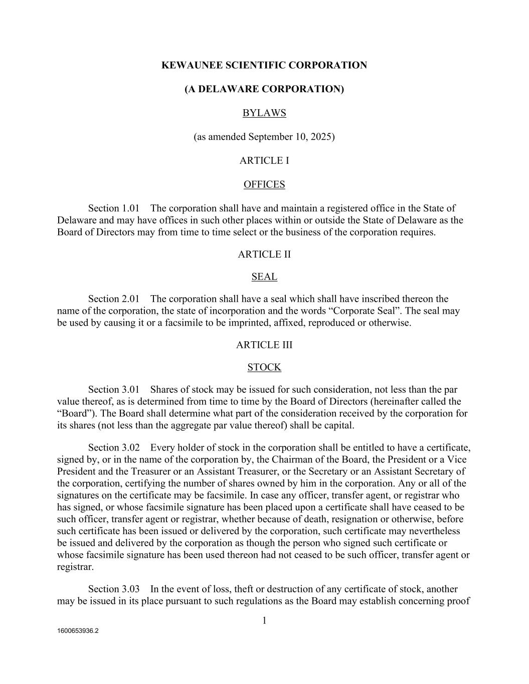 1600653936.2 1 KEWAUNEE SCIENTIFIC CORPORATION (A DELAWARE CORPORATION) BYLAWS (as amended September 10, 2025) ARTICLE I OFFICES Section 1.01 The corporation shall have and maintain a registered office in the State of Delaware and may have offices in such other places within or outside the State of Delaware as the Board of Directors may from time to time select or the business of the corporation requires. ARTICLE II SEAL Section 2.01 The corporation shall have a seal which shall have inscribed thereon the name of the corporation, the state of incorporation and the words “Corporate Seal”. The seal may be used by causing it or a facsimile to be imprinted, affixed, reproduced or otherwise. ARTICLE III STOCK Section 3.01 Shares of stock may be issued for such consideration, not less than the par value thereof, as is determined from time to time by the Board of Directors (hereinafter called the “Board”). The Board shall determine what part of the consideration received by the corporation for its shares (not less than the aggregate par value thereof) shall be capital. Section 3.02 Every holder of stock in the corporation shall be entitled to have a certificate, signed by, or in the name of the corporation by, the Chairman of the Board, the President or a Vice President and the Treasurer or an Assistant Treasurer, or the Secretary or an Assistant Secretary of the corporation, certifying the number of shares owned by him in the corporation. Any or all of the signatures on the certificate may be facsimile. In case any officer, transfer agent, or registrar who has signed, or whose facsimile signature has been placed upon a certificate shall have ceased to be such officer, transfer agent or registrar, whether because of death, resignation or otherwise, before such certificate has been issued or delivered by the corporation, such certificate may nevertheless be issued and delivered by the corporation as though the person who signed such certificate or whose facsimile signature has been used thereon had not ceased to be such officer, transfer agent or registrar. Section 3.03 In the event of loss, theft or destruction of any certificate of stock, another may be issued in its place pursuant to such regulations as the Board may establish concerning proof