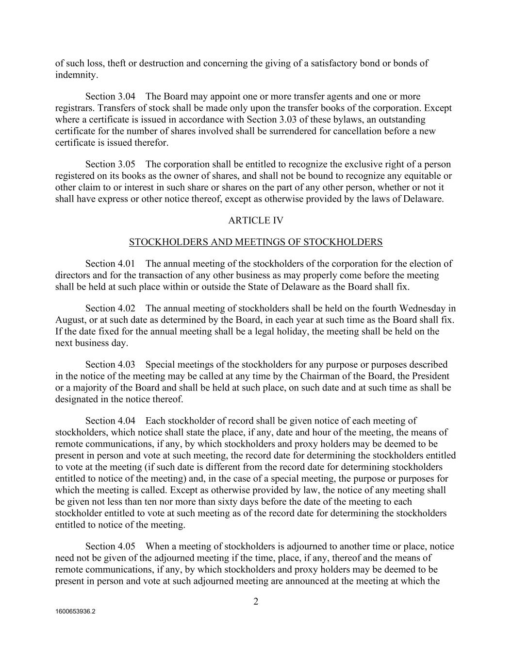 1600653936.2 2 of such loss, theft or destruction and concerning the giving of a satisfactory bond or bonds of indemnity. Section 3.04 The Board may appoint one or more transfer agents and one or more registrars. Transfers of stock shall be made only upon the transfer books of the corporation. Except where a certificate is issued in accordance with Section 3.03 of these bylaws, an outstanding certificate for the number of shares involved shall be surrendered for cancellation before a new certificate is issued therefor. Section 3.05 The corporation shall be entitled to recognize the exclusive right of a person registered on its books as the owner of shares, and shall not be bound to recognize any equitable or other claim to or interest in such share or shares on the part of any other person, whether or not it shall have express or other notice thereof, except as otherwise provided by the laws of Delaware. ARTICLE IV STOCKHOLDERS AND MEETINGS OF STOCKHOLDERS Section 4.01 The annual meeting of the stockholders of the corporation for the election of directors and for the transaction of any other business as may properly come before the meeting shall be held at such place within or outside the State of Delaware as the Board shall fix. Section 4.02 The annual meeting of stockholders shall be held on the fourth Wednesday in August, or at such date as determined by the Board, in each year at such time as the Board shall fix. If the date fixed for the annual meeting shall be a legal holiday, the meeting shall be held on the next business day. Section 4.03 Special meetings of the stockholders for any purpose or purposes described in the notice of the meeting may be called at any time by the Chairman of the Board, the President or a majority of the Board and shall be held at such place, on such date and at such time as shall be designated in the notice thereof. Section 4.04 Each stockholder of record shall be given notice of each meeting of stockholders, which notice shall state the place, if any, date and hour of the meeting, the means of remote communications, if any, by which stockholders and proxy holders may be deemed to be present in person and vote at such meeting, the record date for determining the stockholders entitled to vote at the meeting (if such date is different from the record date for determining stockholders entitled to notice of the meeting) and, in the case of a special meeting, the purpose or purposes for which the meeting is called. Except as otherwise provided by law, the notice of any meeting shall be given not less than ten nor more than sixty days before the date of the meeting to each stockholder entitled to vote at such meeting as of the record date for determining the stockholders entitled to notice of the meeting. Section 4.05 When a meeting of stockholders is adjourned to another time or place, notice need not be given of the adjourned meeting if the time, place, if any, thereof and the means of remote communications, if any, by which stockholders and proxy holders may be deemed to be present in person and vote at such adjourned meeting are announced at the meeting at which the