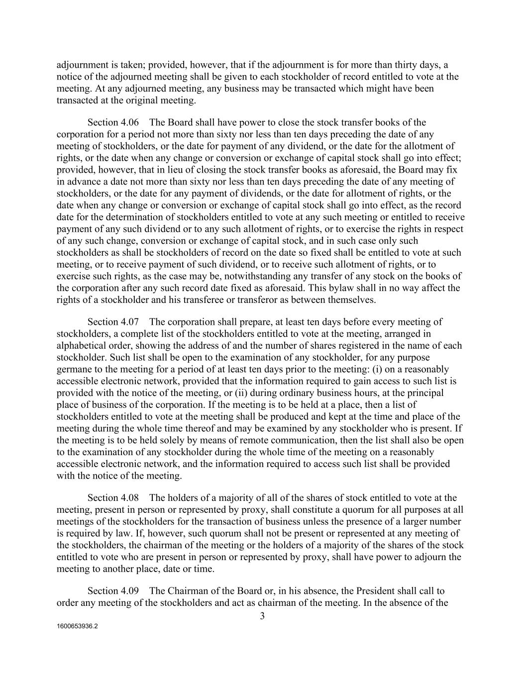 1600653936.2 3 adjournment is taken; provided, however, that if the adjournment is for more than thirty days, a notice of the adjourned meeting shall be given to each stockholder of record entitled to vote at the meeting. At any adjourned meeting, any business may be transacted which might have been transacted at the original meeting. Section 4.06 The Board shall have power to close the stock transfer books of the corporation for a period not more than sixty nor less than ten days preceding the date of any meeting of stockholders, or the date for payment of any dividend, or the date for the allotment of rights, or the date when any change or conversion or exchange of capital stock shall go into effect; provided, however, that in lieu of closing the stock transfer books as aforesaid, the Board may fix in advance a date not more than sixty nor less than ten days preceding the date of any meeting of stockholders, or the date for any payment of dividends, or the date for allotment of rights, or the date when any change or conversion or exchange of capital stock shall go into effect, as the record date for the determination of stockholders entitled to vote at any such meeting or entitled to receive payment of any such dividend or to any such allotment of rights, or to exercise the rights in respect of any such change, conversion or exchange of capital stock, and in such case only such stockholders as shall be stockholders of record on the date so fixed shall be entitled to vote at such meeting, or to receive payment of such dividend, or to receive such allotment of rights, or to exercise such rights, as the case may be, notwithstanding any transfer of any stock on the books of the corporation after any such record date fixed as aforesaid. This bylaw shall in no way affect the rights of a stockholder and his transferee or transferor as between themselves. Section 4.07 The corporation shall prepare, at least ten days before every meeting of stockholders, a complete list of the stockholders entitled to vote at the meeting, arranged in alphabetical order, showing the address of and the number of shares registered in the name of each stockholder. Such list shall be open to the examination of any stockholder, for any purpose germane to the meeting for a period of at least ten days prior to the meeting: (i) on a reasonably accessible electronic network, provided that the information required to gain access to such list is provided with the notice of the meeting, or (ii) during ordinary business hours, at the principal place of business of the corporation. If the meeting is to be held at a place, then a list of stockholders entitled to vote at the meeting shall be produced and kept at the time and place of the meeting during the whole time thereof and may be examined by any stockholder who is present. If the meeting is to be held solely by means of remote communication, then the list shall also be open to the examination of any stockholder during the whole time of the meeting on a reasonably accessible electronic network, and the information required to access such list shall be provided with the notice of the meeting. Section 4.08 The holders of a majority of all of the shares of stock entitled to vote at the meeting, present in person or represented by proxy, shall constitute a quorum for all purposes at all meetings of the stockholders for the transaction of business unless the presence of a larger number is required by law. If, however, such quorum shall not be present or represented at any meeting of the stockholders, the chairman of the meeting or the holders of a majority of the shares of the stock entitled to vote who are present in person or represented by proxy, shall have power to adjourn the meeting to another place, date or time. Section 4.09 The Chairman of the Board or, in his absence, the President shall call to order any meeting of the stockholders and act as chairman of the meeting. In the absence of the