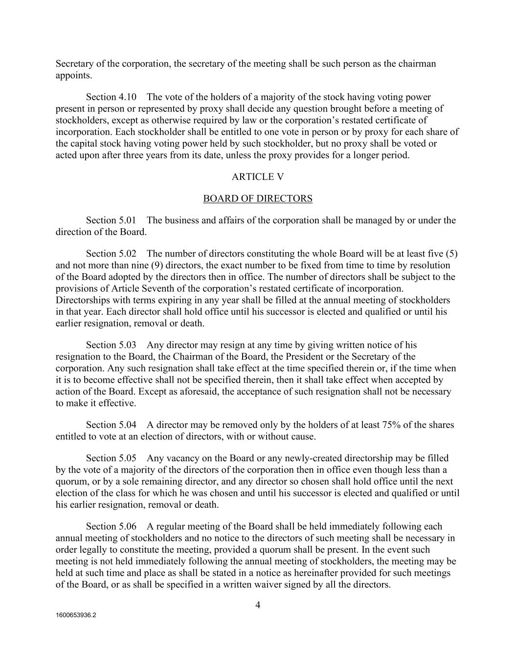 1600653936.2 4 Secretary of the corporation, the secretary of the meeting shall be such person as the chairman appoints. Section 4.10 The vote of the holders of a majority of the stock having voting power present in person or represented by proxy shall decide any question brought before a meeting of stockholders, except as otherwise required by law or the corporation’s restated certificate of incorporation. Each stockholder shall be entitled to one vote in person or by proxy for each share of the capital stock having voting power held by such stockholder, but no proxy shall be voted or acted upon after three years from its date, unless the proxy provides for a longer period. ARTICLE V BOARD OF DIRECTORS Section 5.01 The business and affairs of the corporation shall be managed by or under the direction of the Board. Section 5.02 The number of directors constituting the whole Board will be at least five (5) and not more than nine (9) directors, the exact number to be fixed from time to time by resolution of the Board adopted by the directors then in office. The number of directors shall be subject to the provisions of Article Seventh of the corporation’s restated certificate of incorporation. Directorships with terms expiring in any year shall be filled at the annual meeting of stockholders in that year. Each director shall hold office until his successor is elected and qualified or until his earlier resignation, removal or death. Section 5.03 Any director may resign at any time by giving written notice of his resignation to the Board, the Chairman of the Board, the President or the Secretary of the corporation. Any such resignation shall take effect at the time specified therein or, if the time when it is to become effective shall not be specified therein, then it shall take effect when accepted by action of the Board. Except as aforesaid, the acceptance of such resignation shall not be necessary to make it effective. Section 5.04 A director may be removed only by the holders of at least 75% of the shares entitled to vote at an election of directors, with or without cause. Section 5.05 Any vacancy on the Board or any newly-created directorship may be filled by the vote of a majority of the directors of the corporation then in office even though less than a quorum, or by a sole remaining director, and any director so chosen shall hold office until the next election of the class for which he was chosen and until his successor is elected and qualified or until his earlier resignation, removal or death. Section 5.06 A regular meeting of the Board shall be held immediately following each annual meeting of stockholders and no notice to the directors of such meeting shall be necessary in order legally to constitute the meeting, provided a quorum shall be present. In the event such meeting is not held immediately following the annual meeting of stockholders, the meeting may be held at such time and place as shall be stated in a notice as hereinafter provided for such meetings of the Board, or as shall be specified in a written waiver signed by all the directors.