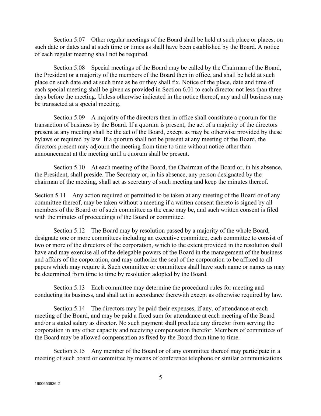 1600653936.2 5 Section 5.07 Other regular meetings of the Board shall be held at such place or places, on such date or dates and at such time or times as shall have been established by the Board. A notice of each regular meeting shall not be required. Section 5.08 Special meetings of the Board may be called by the Chairman of the Board, the President or a majority of the members of the Board then in office, and shall be held at such place on such date and at such time as he or they shall fix. Notice of the place, date and time of each special meeting shall be given as provided in Section 6.01 to each director not less than three days before the meeting. Unless otherwise indicated in the notice thereof, any and all business may be transacted at a special meeting. Section 5.09 A majority of the directors then in office shall constitute a quorum for the transaction of business by the Board. If a quorum is present, the act of a majority of the directors present at any meeting shall be the act of the Board, except as may be otherwise provided by these bylaws or required by law. If a quorum shall not be present at any meeting of the Board, the directors present may adjourn the meeting from time to time without notice other than announcement at the meeting until a quorum shall be present. Section 5.10 At each meeting of the Board, the Chairman of the Board or, in his absence, the President, shall preside. The Secretary or, in his absence, any person designated by the chairman of the meeting, shall act as secretary of such meeting and keep the minutes thereof. Section 5.11 Any action required or permitted to be taken at any meeting of the Board or of any committee thereof, may be taken without a meeting if a written consent thereto is signed by all members of the Board or of such committee as the case may be, and such written consent is filed with the minutes of proceedings of the Board or committee. Section 5.12 The Board may by resolution passed by a majority of the whole Board, designate one or more committees including an executive committee, each committee to consist of two or more of the directors of the corporation, which to the extent provided in the resolution shall have and may exercise all of the delegable powers of the Board in the management of the business and affairs of the corporation, and may authorize the seal of the corporation to be affixed to all papers which may require it. Such committee or committees shall have such name or names as may be determined from time to time by resolution adopted by the Board. Section 5.13 Each committee may determine the procedural rules for meeting and conducting its business, and shall act in accordance therewith except as otherwise required by law. Section 5.14 The directors may be paid their expenses, if any, of attendance at each meeting of the Board, and may be paid a fixed sum for attendance at each meeting of the Board and/or a stated salary as director. No such payment shall preclude any director from serving the corporation in any other capacity and receiving compensation therefor. Members of committees of the Board may be allowed compensation as fixed by the Board from time to time. Section 5.15 Any member of the Board or of any committee thereof may participate in a meeting of such board or committee by means of conference telephone or similar communications