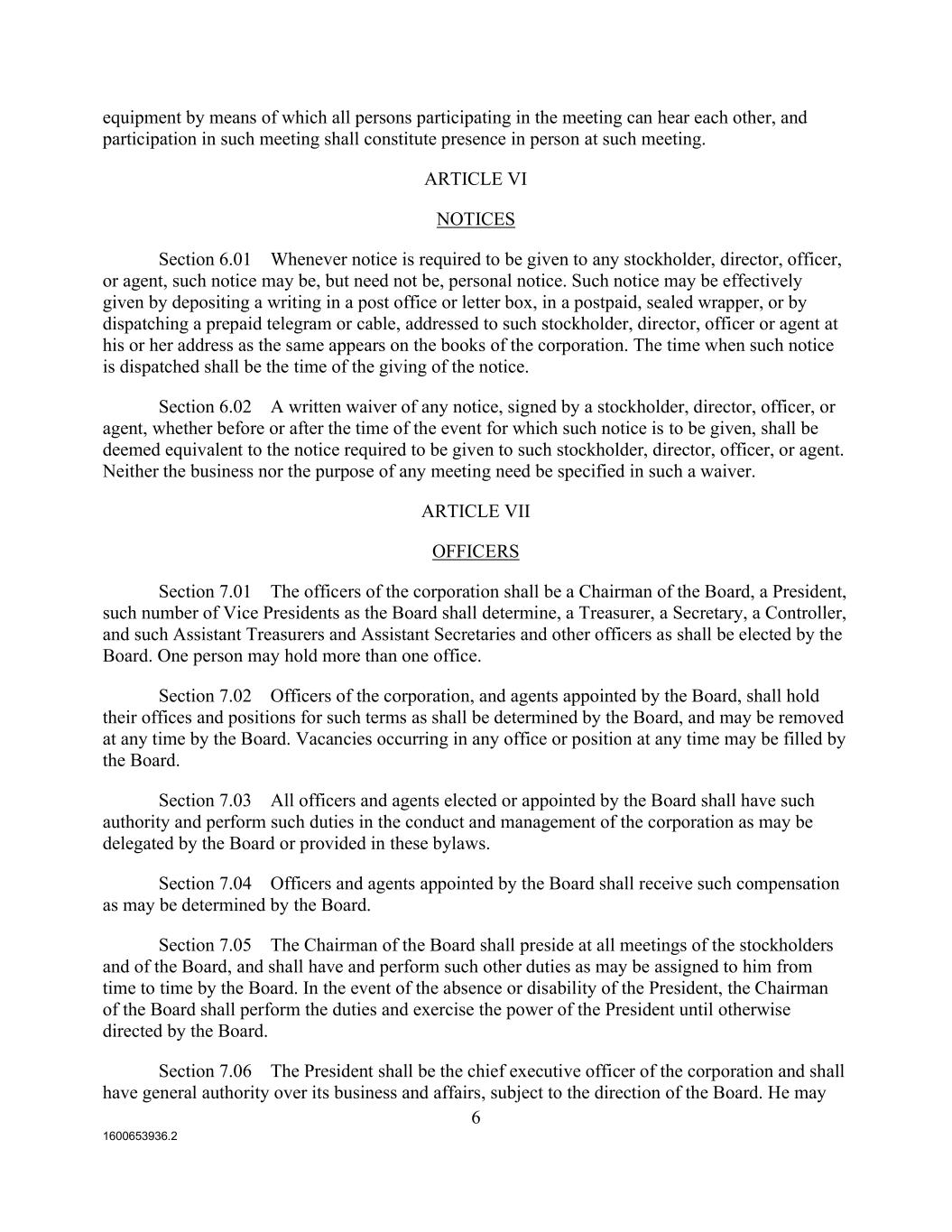 1600653936.2 6 equipment by means of which all persons participating in the meeting can hear each other, and participation in such meeting shall constitute presence in person at such meeting. ARTICLE VI NOTICES Section 6.01 Whenever notice is required to be given to any stockholder, director, officer, or agent, such notice may be, but need not be, personal notice. Such notice may be effectively given by depositing a writing in a post office or letter box, in a postpaid, sealed wrapper, or by dispatching a prepaid telegram or cable, addressed to such stockholder, director, officer or agent at his or her address as the same appears on the books of the corporation. The time when such notice is dispatched shall be the time of the giving of the notice. Section 6.02 A written waiver of any notice, signed by a stockholder, director, officer, or agent, whether before or after the time of the event for which such notice is to be given, shall be deemed equivalent to the notice required to be given to such stockholder, director, officer, or agent. Neither the business nor the purpose of any meeting need be specified in such a waiver. ARTICLE VII OFFICERS Section 7.01 The officers of the corporation shall be a Chairman of the Board, a President, such number of Vice Presidents as the Board shall determine, a Treasurer, a Secretary, a Controller, and such Assistant Treasurers and Assistant Secretaries and other officers as shall be elected by the Board. One person may hold more than one office. Section 7.02 Officers of the corporation, and agents appointed by the Board, shall hold their offices and positions for such terms as shall be determined by the Board, and may be removed at any time by the Board. Vacancies occurring in any office or position at any time may be filled by the Board. Section 7.03 All officers and agents elected or appointed by the Board shall have such authority and perform such duties in the conduct and management of the corporation as may be delegated by the Board or provided in these bylaws. Section 7.04 Officers and agents appointed by the Board shall receive such compensation as may be determined by the Board. Section 7.05 The Chairman of the Board shall preside at all meetings of the stockholders and of the Board, and shall have and perform such other duties as may be assigned to him from time to time by the Board. In the event of the absence or disability of the President, the Chairman of the Board shall perform the duties and exercise the power of the President until otherwise directed by the Board. Section 7.06 The President shall be the chief executive officer of the corporation and shall have general authority over its business and affairs, subject to the direction of the Board. He may