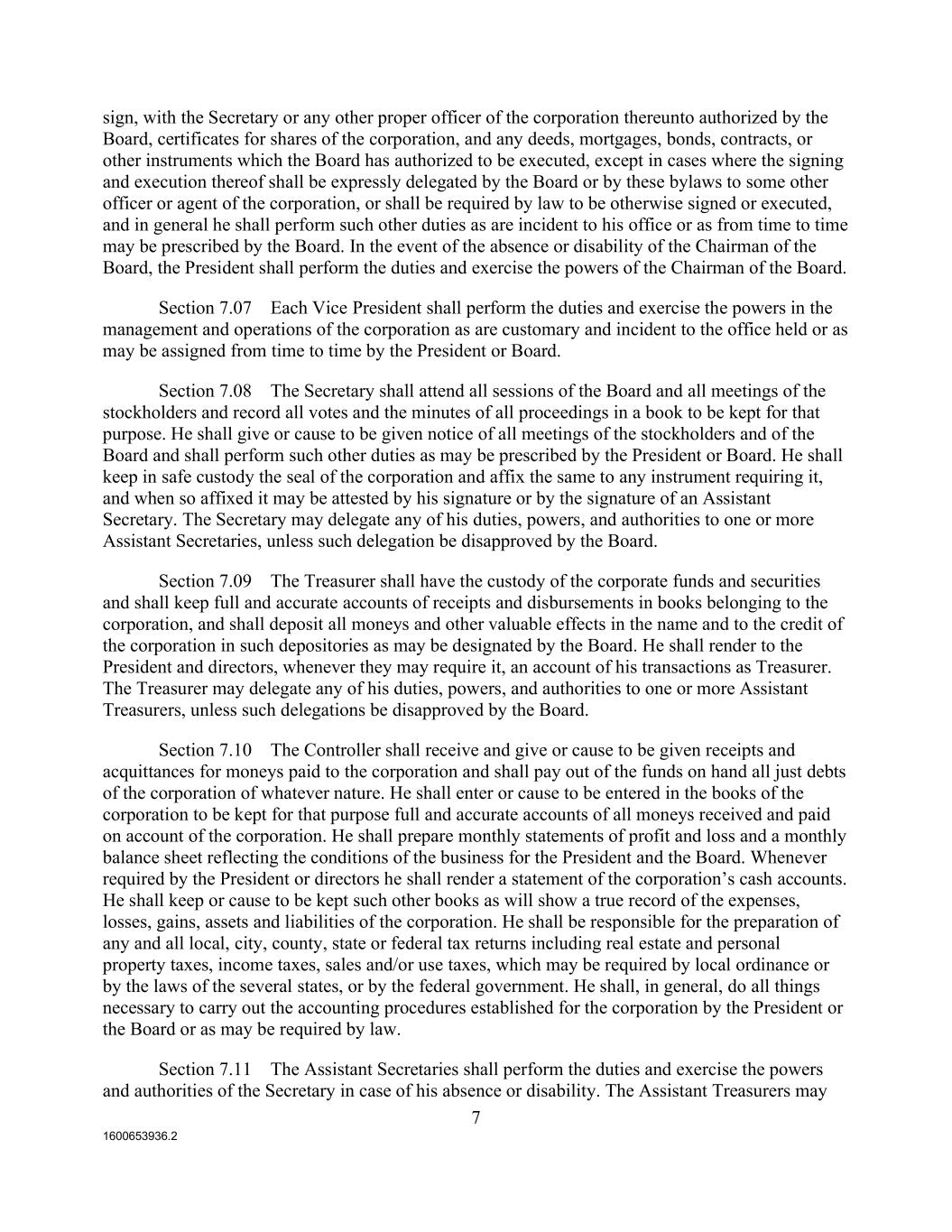 1600653936.2 7 sign, with the Secretary or any other proper officer of the corporation thereunto authorized by the Board, certificates for shares of the corporation, and any deeds, mortgages, bonds, contracts, or other instruments which the Board has authorized to be executed, except in cases where the signing and execution thereof shall be expressly delegated by the Board or by these bylaws to some other officer or agent of the corporation, or shall be required by law to be otherwise signed or executed, and in general he shall perform such other duties as are incident to his office or as from time to time may be prescribed by the Board. In the event of the absence or disability of the Chairman of the Board, the President shall perform the duties and exercise the powers of the Chairman of the Board. Section 7.07 Each Vice President shall perform the duties and exercise the powers in the management and operations of the corporation as are customary and incident to the office held or as may be assigned from time to time by the President or Board. Section 7.08 The Secretary shall attend all sessions of the Board and all meetings of the stockholders and record all votes and the minutes of all proceedings in a book to be kept for that purpose. He shall give or cause to be given notice of all meetings of the stockholders and of the Board and shall perform such other duties as may be prescribed by the President or Board. He shall keep in safe custody the seal of the corporation and affix the same to any instrument requiring it, and when so affixed it may be attested by his signature or by the signature of an Assistant Secretary. The Secretary may delegate any of his duties, powers, and authorities to one or more Assistant Secretaries, unless such delegation be disapproved by the Board. Section 7.09 The Treasurer shall have the custody of the corporate funds and securities and shall keep full and accurate accounts of receipts and disbursements in books belonging to the corporation, and shall deposit all moneys and other valuable effects in the name and to the credit of the corporation in such depositories as may be designated by the Board. He shall render to the President and directors, whenever they may require it, an account of his transactions as Treasurer. The Treasurer may delegate any of his duties, powers, and authorities to one or more Assistant Treasurers, unless such delegations be disapproved by the Board. Section 7.10 The Controller shall receive and give or cause to be given receipts and acquittances for moneys paid to the corporation and shall pay out of the funds on hand all just debts of the corporation of whatever nature. He shall enter or cause to be entered in the books of the corporation to be kept for that purpose full and accurate accounts of all moneys received and paid on account of the corporation. He shall prepare monthly statements of profit and loss and a monthly balance sheet reflecting the conditions of the business for the President and the Board. Whenever required by the President or directors he shall render a statement of the corporation’s cash accounts. He shall keep or cause to be kept such other books as will show a true record of the expenses, losses, gains, assets and liabilities of the corporation. He shall be responsible for the preparation of any and all local, city, county, state or federal tax returns including real estate and personal property taxes, income taxes, sales and/or use taxes, which may be required by local ordinance or by the laws of the several states, or by the federal government. He shall, in general, do all things necessary to carry out the accounting procedures established for the corporation by the President or the Board or as may be required by law. Section 7.11 The Assistant Secretaries shall perform the duties and exercise the powers and authorities of the Secretary in case of his absence or disability. The Assistant Treasurers may