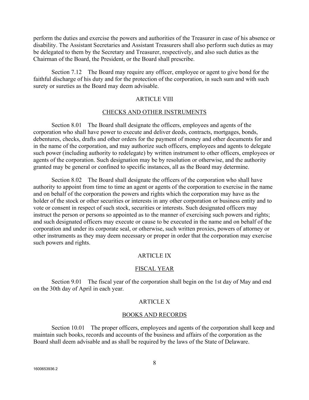 1600653936.2 8 perform the duties and exercise the powers and authorities of the Treasurer in case of his absence or disability. The Assistant Secretaries and Assistant Treasurers shall also perform such duties as may be delegated to them by the Secretary and Treasurer, respectively, and also such duties as the Chairman of the Board, the President, or the Board shall prescribe. Section 7.12 The Board may require any officer, employee or agent to give bond for the faithful discharge of his duty and for the protection of the corporation, in such sum and with such surety or sureties as the Board may deem advisable. ARTICLE VIII CHECKS AND OTHER INSTRUMENTS Section 8.01 The Board shall designate the officers, employees and agents of the corporation who shall have power to execute and deliver deeds, contracts, mortgages, bonds, debentures, checks, drafts and other orders for the payment of money and other documents for and in the name of the corporation, and may authorize such officers, employees and agents to delegate such power (including authority to redelegate) by written instrument to other officers, employees or agents of the corporation. Such designation may be by resolution or otherwise, and the authority granted may be general or confined to specific instances, all as the Board may determine. Section 8.02 The Board shall designate the officers of the corporation who shall have authority to appoint from time to time an agent or agents of the corporation to exercise in the name and on behalf of the corporation the powers and rights which the corporation may have as the holder of the stock or other securities or interests in any other corporation or business entity and to vote or consent in respect of such stock, securities or interests. Such designated officers may instruct the person or persons so appointed as to the manner of exercising such powers and rights; and such designated officers may execute or cause to be executed in the name and on behalf of the corporation and under its corporate seal, or otherwise, such written proxies, powers of attorney or other instruments as they may deem necessary or proper in order that the corporation may exercise such powers and rights. ARTICLE IX FISCAL YEAR Section 9.01 The fiscal year of the corporation shall begin on the 1st day of May and end on the 30th day of April in each year. ARTICLE X BOOKS AND RECORDS Section 10.01 The proper officers, employees and agents of the corporation shall keep and maintain such books, records and accounts of the business and affairs of the corporation as the Board shall deem advisable and as shall be required by the laws of the State of Delaware.