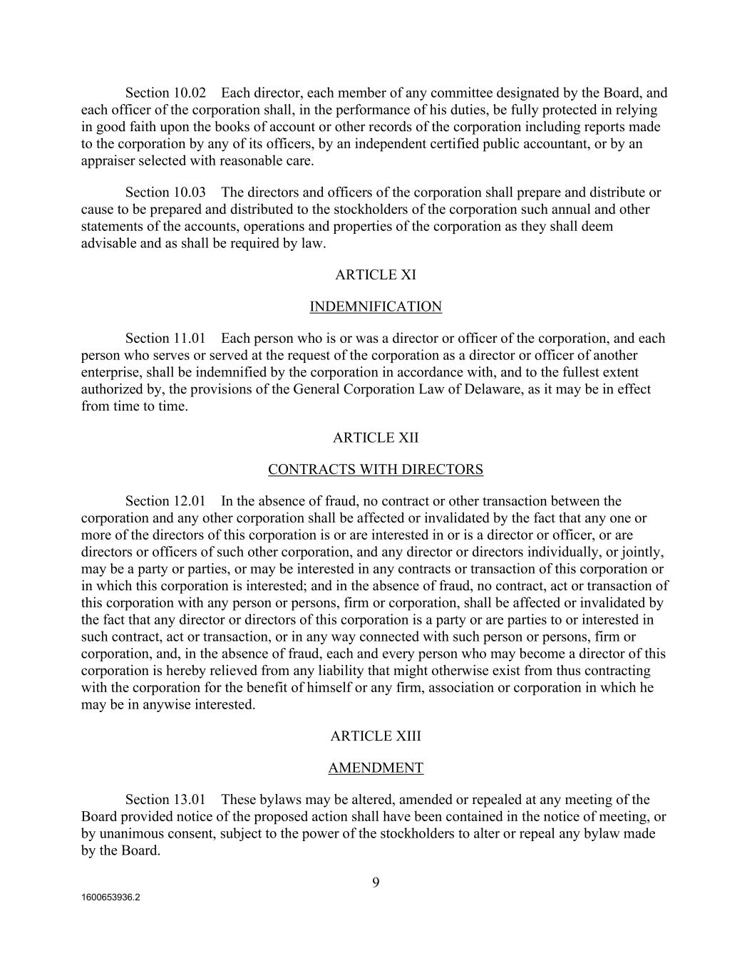 1600653936.2 9 Section 10.02 Each director, each member of any committee designated by the Board, and each officer of the corporation shall, in the performance of his duties, be fully protected in relying in good faith upon the books of account or other records of the corporation including reports made to the corporation by any of its officers, by an independent certified public accountant, or by an appraiser selected with reasonable care. Section 10.03 The directors and officers of the corporation shall prepare and distribute or cause to be prepared and distributed to the stockholders of the corporation such annual and other statements of the accounts, operations and properties of the corporation as they shall deem advisable and as shall be required by law. ARTICLE XI INDEMNIFICATION Section 11.01 Each person who is or was a director or officer of the corporation, and each person who serves or served at the request of the corporation as a director or officer of another enterprise, shall be indemnified by the corporation in accordance with, and to the fullest extent authorized by, the provisions of the General Corporation Law of Delaware, as it may be in effect from time to time. ARTICLE XII CONTRACTS WITH DIRECTORS Section 12.01 In the absence of fraud, no contract or other transaction between the corporation and any other corporation shall be affected or invalidated by the fact that any one or more of the directors of this corporation is or are interested in or is a director or officer, or are directors or officers of such other corporation, and any director or directors individually, or jointly, may be a party or parties, or may be interested in any contracts or transaction of this corporation or in which this corporation is interested; and in the absence of fraud, no contract, act or transaction of this corporation with any person or persons, firm or corporation, shall be affected or invalidated by the fact that any director or directors of this corporation is a party or are parties to or interested in such contract, act or transaction, or in any way connected with such person or persons, firm or corporation, and, in the absence of fraud, each and every person who may become a director of this corporation is hereby relieved from any liability that might otherwise exist from thus contracting with the corporation for the benefit of himself or any firm, association or corporation in which he may be in anywise interested. ARTICLE XIII AMENDMENT Section 13.01 These bylaws may be altered, amended or repealed at any meeting of the Board provided notice of the proposed action shall have been contained in the notice of meeting, or by unanimous consent, subject to the power of the stockholders to alter or repeal any bylaw made by the Board.
