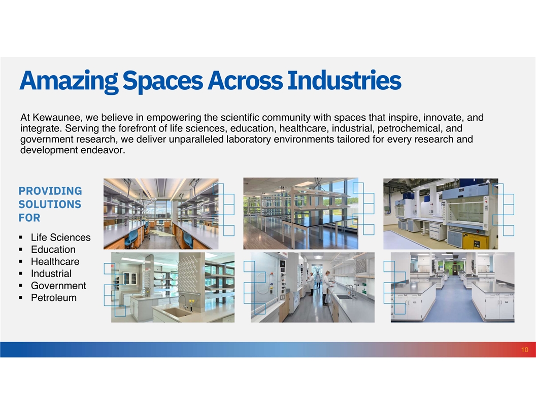 Amazing Spaces Across Industries At Kewaunee, we believe in empowering the scientific community with spaces that inspire, innovate, and integrate. Serving the forefront of life sciences, education, healthcare, industrial, petrochemical, and government research, we deliver unparalleled laboratory environments tailored for every research and development endeavor. PROVIDING SOLUTIONS FOR § Life Sciences § Education § Healthcare § Industrial § Government § Petroleum 10