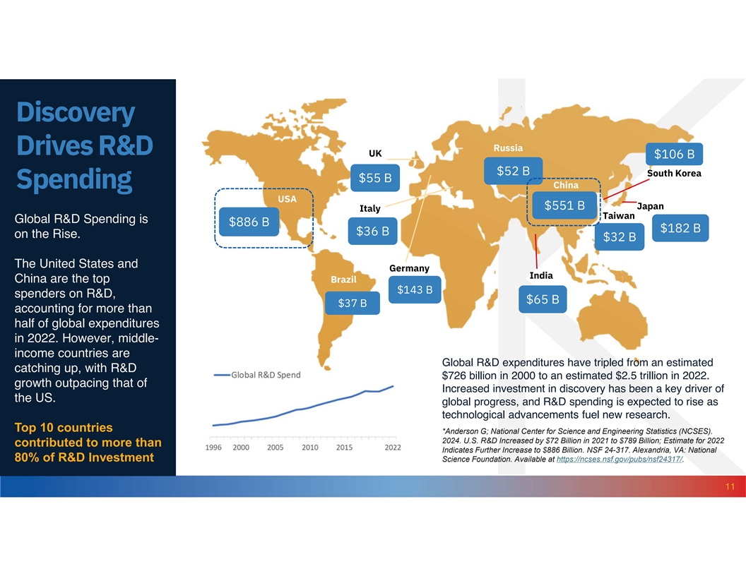 Discovery Russia Drives R&D UK $106 B $52 B South Korea $55 B China Spending USA $551 B Japan Italy Taiwan Global R&D Spending is $886 B $182 B $36 B on the Rise. $32 B The United States and Germany India China are the top Brazil $143 B spenders on R&D, $65 B $37 B accounting for more than half of global expenditures in 2022. However, middle- income countries are Global R&D expenditures have tripled from an estimated catching up, with R&D $726 billion in 2000 to an estimated $2.5 trillion in 2022. growth outpacing that of Increased investment in discovery has been a key driver of the US. global progress, and R&D spending is expected to rise as technological advancements fuel new research. Top 10 countries *Anderson G; National Center for Science and Engineering Statistics (NCSES). 2024. U.S. R&D Increased by $72 Billion in 2021 to $789 Billion; Estimate for 2022 contributed to more than Indicates Further Increase to $886 Billion. NSF 24-317. Alexandria, VA: National 80% of R&D Investment Science Foundation. Available at https://ncses.nsf.gov/pubs/nsf24317/. 11