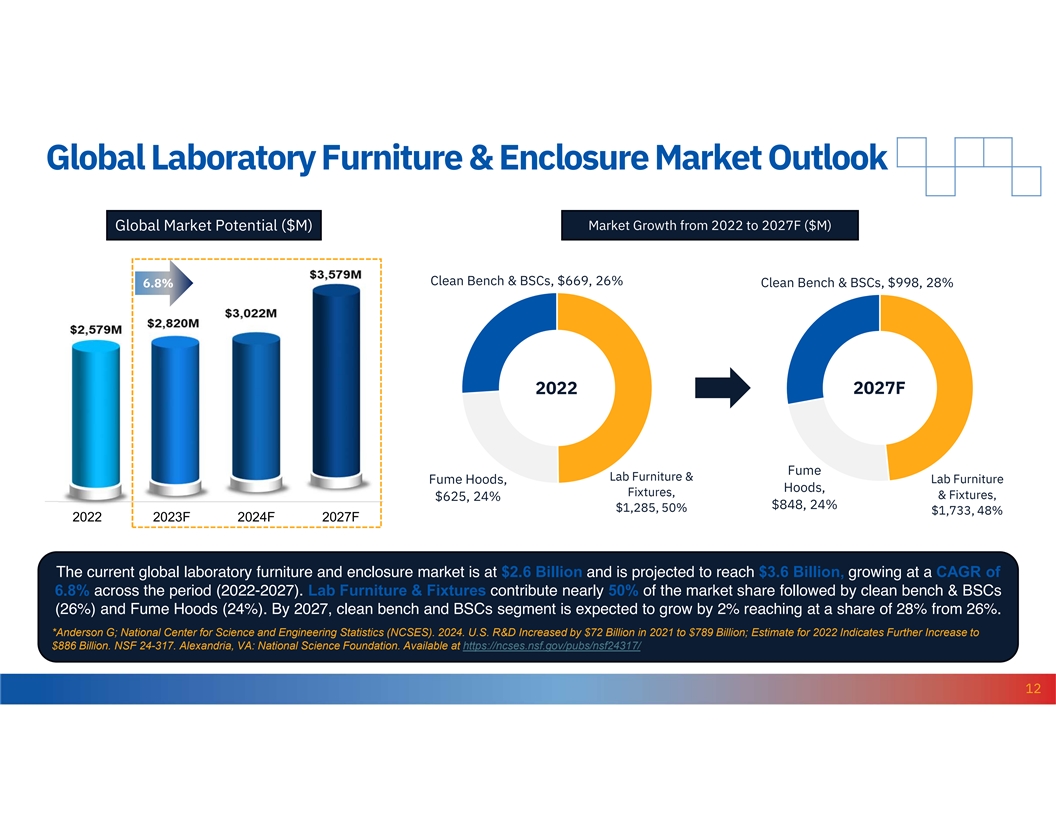 Global Laboratory Furniture & Enclosure Market Outlook Global Market Potential ($M) Market Growth from 2022 to 2027F ($M) Clean Bench & BSCs, $669, 26% 6.8% Clean Bench & BSCs, $998, 28% 2022 2027F 2027F Fume Lab Furniture & Fume Hoods, Lab Furniture Hoods, Fixtures, & Fixtures, $625, 24% $848, 24% $1,285, 50% $1,733, 48% 2022 2023F 2024F 2027F The current global laboratory furniture and enclosure market is at $2.6 Billion and is projected to reach $3.6 Billion, growing at a CAGR of 6.8% across the period (2022-2027). Lab Furniture & Fixtures contribute nearly 50% of the market share followed by clean bench & BSCs (26%) and Fume Hoods (24%). By 2027, clean bench and BSCs segment is expected to grow by 2% reaching at a share of 28% from 26%. *Anderson G; National Center for Science and Engineering Statistics (NCSES). 2024. U.S. R&D Increased by $72 Billion in 2021 to $789 Billion; Estimate for 2022 Indicates Further Increase to $886 Billion. NSF 24-317. Alexandria, VA: National Science Foundation. Available at https://ncses.nsf.gov/pubs/nsf24317/. 12