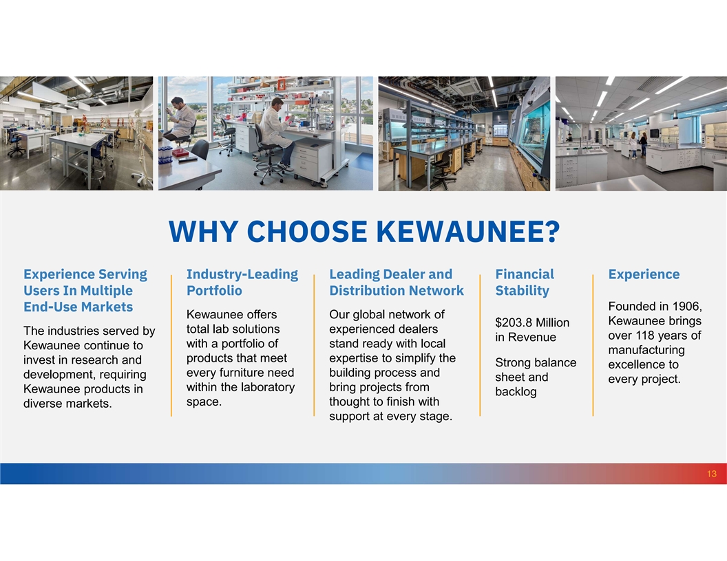 WHY CHOOSE KEWAUNEE? Experience Serving Industry-Leading Leading Dealer and Financial Experience Users In Multiple Portfolio Distribution Network Stability Founded in 1906, End-Use Markets Kewaunee offers Our global network of Kewaunee brings $203.8 Million total lab solutions experienced dealers The industries served by over 118 years of in Revenue with a portfolio of stand ready with local Kewaunee continue to manufacturing products that meet expertise to simplify the invest in research and Strong balance excellence to every furniture need building process and development, requiring sheet and every project. within the laboratory bring projects from Kewaunee products in backlog space. thought to finish with diverse markets. support at every stage. 13