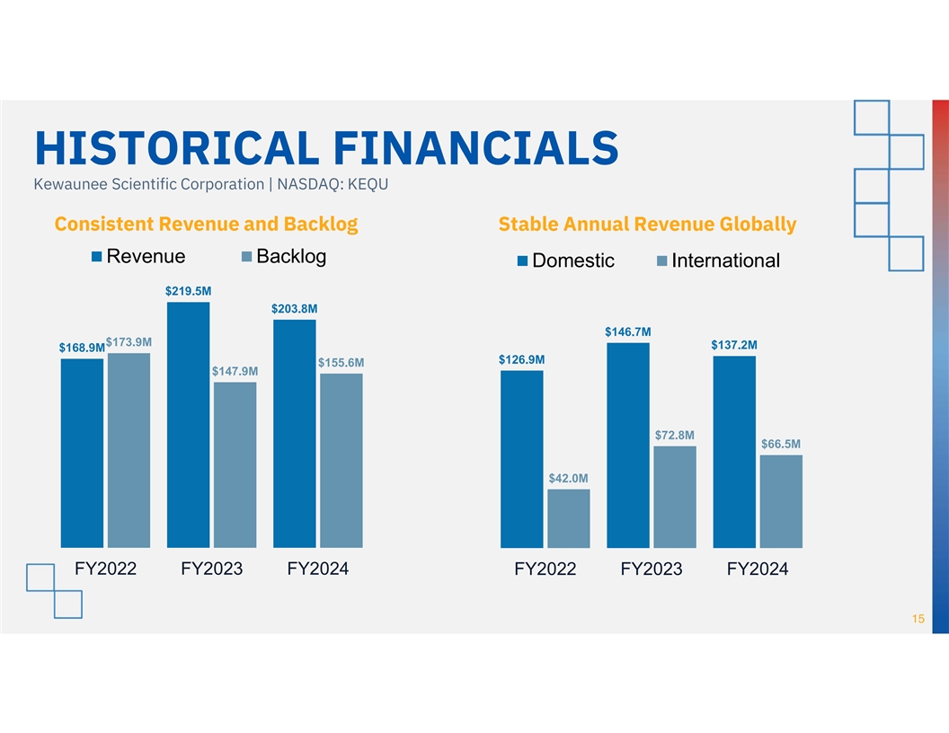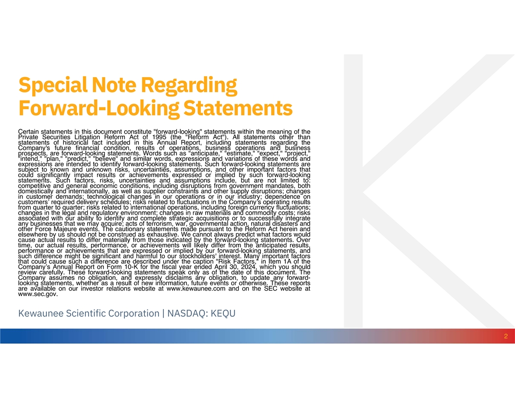 Special Note Regarding Forward-Looking Statements Certain statements in this document constitute forward-looking statements within the meaning of the Private Securities Litigation Reform Act of 1995 (the Reform Act ). All statements other than statements of historical fact included in this Annual Report, including statements regarding the Company's future financial condition, results of operations, business operations and business prospects, are forward-looking statements. Words such as anticipate, estimate, expect, project, intend, plan, predict, believe and similar words, expressions and variations of these words and expressions are intended to identify forward-looking statements. Such forward-looking statements are subject to known and unknown risks, uncertainties, assumptions, and other important factors that could significantly impact results or achievements expressed or implied by such forward-looking statements. Such factors, risks, uncertainties and assumptions include, but are not limited to: competitive and general economic conditions, including disruptions from government mandates, both domestically and internationally, as well as supplier constraints and other supply disruptions; changes in customer demands; technological changes in our operations or in our industry; dependence on customers’ required delivery schedules; risks related to fluctuations in the Company’s operating results from quarter to quarter; risks related to international operations, including foreign currency fluctuations; changes in the legal and regulatory environment; changes in raw materials and commodity costs; risks associated with our ability to identify and complete strategic acquisitions or to successfully integrate any businesses that we may acquire; acts of terrorism, war, governmental action, natural disasters and other Force Majeure events. The cautionary statements made pursuant to the Reform Act herein and elsewhere by us should not be construed as exhaustive. We cannot always predict what factors would cause actual results to differ materially from those indicated by the forward-looking statements. Over time, our actual results, performance, or achievements will likely differ from the anticipated results, performance or achievements that are expressed or implied by our forward-looking statements, and such difference might be significant and harmful to our stockholders' interest. Many important factors that could cause such a difference are described under the caption Risk Factors, in Item 1A of the Company’s Annual Report on Form 10-K for the fiscal year ended April 30, 2024, which you should review carefully. These forward-looking statements speak only as of the date of this document. The Company assumes no obligation, and expressly disclaims any obligation, to update any forward- looking statements, whether as a result of new information, future events or otherwise. These reports are available on our investor relations website at www.kewaunee.com and on the SEC website at www.sec.gov. Kewaunee Scientific Corporation | NASDAQ: KEQU 2