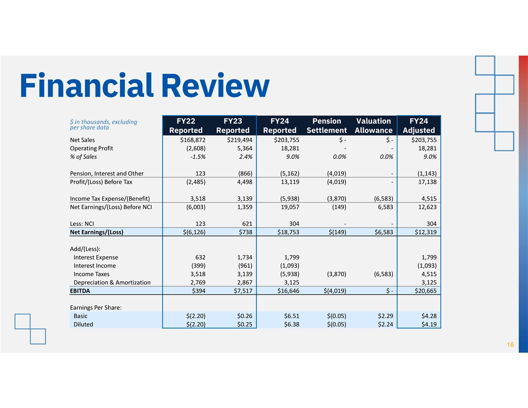 Financial Review $ in thousands, excluding FY22 FY23 FY24 Pension Valuation FY24 per share data Reported Reported Reported Settlement Allowance Adjusted Net Sales $168,872 $219,494 $203,755 $ - $ - $203,755 Operating Profit (2,608) 5,364 18,281 - - 18,281 % of Sales -1.5% 2.4% 9.0% 0.0% 0.0% 9.0% Pension, Interest and Other 123 (866) (5,162) (4,019) - (1,143) Profit/(Loss) Before Tax (2,485) 4,498 13,119 (4,019) - 17,138 Income Tax Expense/(Benefit) 3,518 3,139 (5,938) (3,870) (6,583) 4,515 Net Earnings/(Loss) Before NCI (6,003) 1,359 19,057 (149) 6,583 12,623 Less: NCI 123 621 304 - - 304 Net Earnings/(Loss) $(6,126) $738 $18,753 $(149) $6,583 $12,319 Add/(Less): Interest Expense 632 1,734 1,799 1,799 Interest Income (399) (961) (1,093) (1,093) Income Taxes 3,518 3,139 (5,938) (3,870) (6,583) 4,515 Depreciation & Amortization 2,769 2,867 3,125 3,125 EBITDA $394 $7,517 $16,646 $(4,019) $ - $20,665 Earnings Per Share: Basic $(2.20) $0.26 $6.51 $(0.05) $2.29 $4.28 Diluted $(2.20) $0.25 $6.38 $(0.05) $2.24 $4.19 16