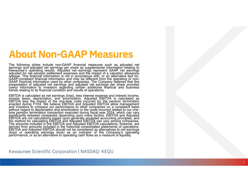 About Non-GAAP Measures The following slides include non-GAAP financial measures such as adjusted net earnings and adjusted net earnings per share as supplemental information relating to Kewaunee’s operating results. Adjusted net earnings represent GAAP net earnings adjusted for net pension settlement expenses and the impact of a valuation allowance release. This financial information is not in accordance with, or an alternative fact for, GAAP-compliant financial information and may be different from the operating or non- GAAP financial information used by other companies. The Company believes that this presentation of adjusted net earnings and adjusted net earnings per share provides useful information to investors regarding certain additional financial and business trends relating to its financial condition and results of operations. EBITDA is calculated as net earnings (loss), less interest expense and interest income, income taxes, depreciation, and amortization. Adjusted EBITDA is calculated as EBITDA less the impact of the one-time costs incurred for the pension termination enacted during FY24. We believe EBITDA and Adjusted EBITDA allow management and investors to compare our performance to other companies on a consistent basis without regard to depreciation and amortization or the costs incurred related to our one- time pension termination transaction executed during fiscal year 2024, which can vary significantly between companies depending upon many factors. EBITDA and Adjusted EBITDA are not calculations based upon generally accepted accounting principles, and the method for calculating EBITDA and Adjusted EBITDA can vary among companies. The amounts included in the EBITDA and Adjusted EBITDA calculations, however, are derived from amounts included in the historical consolidated statements of operations. EBITDA and Adjusted EBITDA should not be considered as alternatives to net earnings (loss) or operating earnings (loss) as an indicator of the Company’s operating performance, or as an alternative to operating cash flows as a measure of liquidity. Kewaunee Scientific Corporation | NASDAQ: KEQU 3