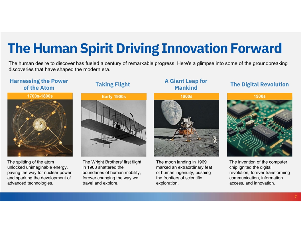 The Human Spirit Driving Innovation Forward The human desire to discover has fueled a century of remarkable progress. Here's a glimpse into some of the groundbreaking discoveries that have shaped the modern era. Harnessing the Power A Giant Leap for Taking Flight The Digital Revolution of the Atom Mankind 1700s-1800s 1900s 1900s Early 1900s The splitting of the atom The Wright Brothers' first flight The moon landing in 1969 The invention of the computer unlocked unimaginable energy, in 1903 shattered the marked an extraordinary feat chip ignited the digital paving the way for nuclear power boundaries of human mobility, of human ingenuity, pushing revolution, forever transforming and sparking the development of forever changing the way we the frontiers of scientific communication, information advanced technologies. travel and explore. exploration. access, and innovation. 7
