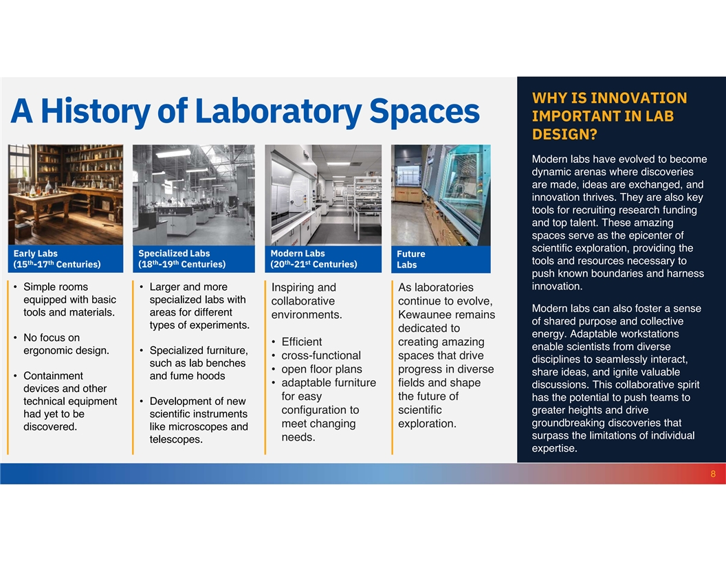 WHY IS INNOVATION IMPORTANT IN LAB A History of Laboratory Spaces DESIGN? Modern labs have evolved to become dynamic arenas where discoveries are made, ideas are exchanged, and innovation thrives. They are also key tools for recruiting research funding and top talent. These amazing spaces serve as the epicenter of scientific exploration, providing the Early Labs Specialized Labs Modern Labs Future tools and resources necessary to th th th th th st (15 -17 Centuries) (18 -19 Centuries) (20 -21 Centuries) Labs push known boundaries and harness innovation. • Simple rooms • Larger and more Inspiring and As laboratories equipped with basic specialized labs with collaborative continue to evolve, Modern labs can also foster a sense tools and materials. areas for different environments. Kewaunee remains of shared purpose and collective types of experiments. dedicated to energy. Adaptable workstations • No focus on • Efficient creating amazing enable scientists from diverse ergonomic design. • Specialized furniture, • cross-functional spaces that drive disciplines to seamlessly interact, such as lab benches • open floor plans progress in diverse share ideas, and ignite valuable • Containment and fume hoods • adaptable furniture fields and shape discussions. This collaborative spirit devices and other for easy the future of has the potential to push teams to technical equipment • Development of new configuration to scientific greater heights and drive had yet to be scientific instruments groundbreaking discoveries that meet changing exploration. discovered. like microscopes and surpass the limitations of individual needs. telescopes. expertise. 8