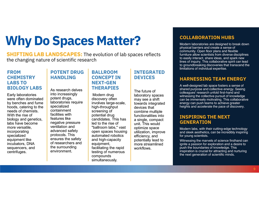 COLLABORATION HUBS Why Do Spaces Matter? Modern laboratories are designed to break down physical barriers and create a sense of community. Open floor plans and flexible furniture allow scientists from diverse disciplines SHIFTING LAB LANDSCAPES: The evolution of lab spaces reflects to easily interact, share ideas, and spark new the changing nature of scientific research lines of inquiry. This collaborative spirit can lead to groundbreaking discoveries that transcend the limitations of individual expertise. FROM POTENT DRUG B A LLROOM INTEGRATED CHEMISTRY HANDLING CONCEPT IN DEVICES HARNESSING TEAM ENERGY LABS TO NEXT-GEN A well-designed lab space fosters a sense of BIOLOGY LABS THERAPIES shared purpose and collective energy. Seeing As research delves The future of colleagues' research unfold first-hand and into increasingly Early laboratories Modern drug laboratory spaces witnessing the collective pursuit of knowledge potent drugs, were often dominated discovery often may see a shift can be immensely motivating. This collaborative laboratories require by benches and fume involves large-scale, energy can push teams to achieve greater towards integrated specialized heights and accelerate the pace of discovery. hoods, catering to the high-throughput devices that containment needs of chemists. screening of combine multiple facilities with With the rise of potential drug functionalities into INSPIRING THE NEXT features like biology and genetics, candidates. This has a single, compact negative pressure GENERATION labs have become led to the rise of unit. This would ventilation and more versatile, ballroom labs, vast optimize space Modern labs, with their cutting-edge technology advanced safety incorporating open spaces housing utilization, improve and sleek aesthetics, can be incredibly inspiring protocols. This specialized automated robotics for young scientists. efficiency, and ensures the safety equipment like and high-capacity potentially lead to Witnessing the marvels of science firsthand can of researchers and incubators, DNA equipment, ignite a passion for exploration and a desire to more streamlined the surrounding push the boundaries of knowledge. This sequencers, and facilitating the rapid workflows. environment. inspiration is crucial for attracting and nurturing centrifuges. testing of numerous the next generation of scientific minds. compounds simultaneously. 9
