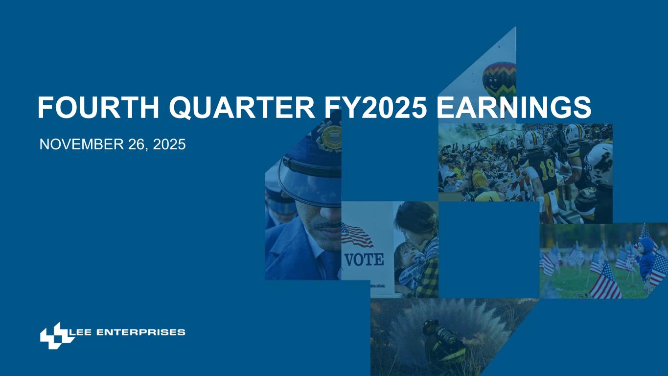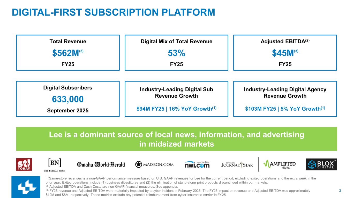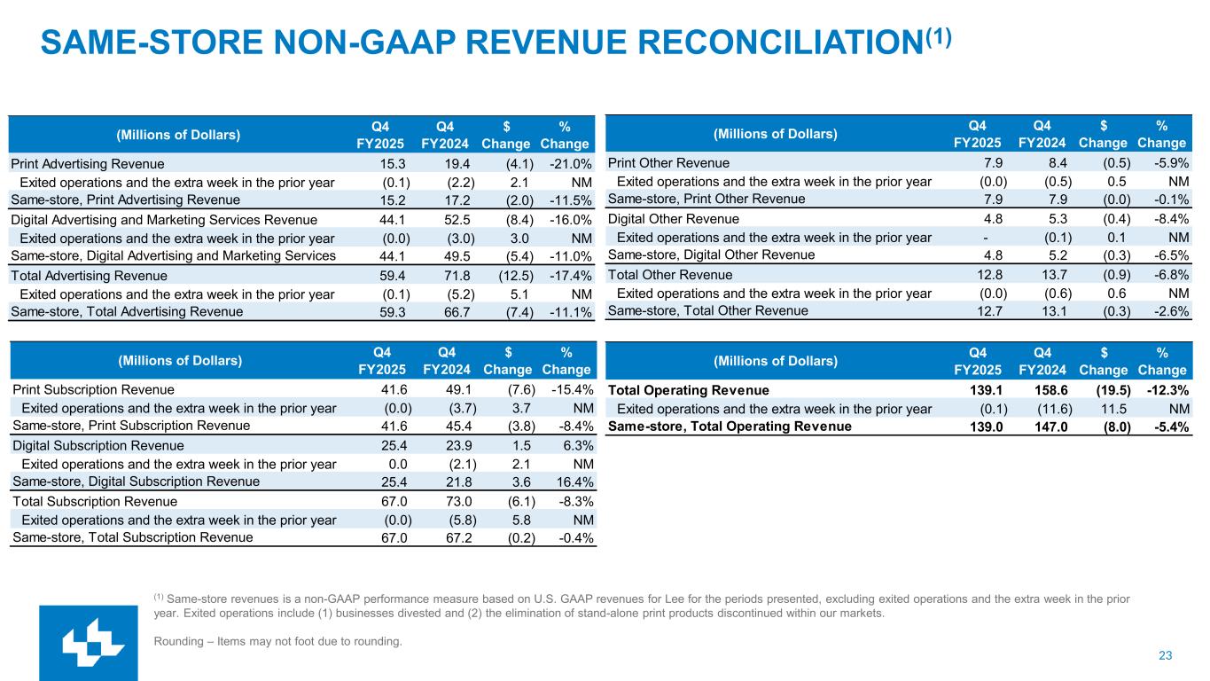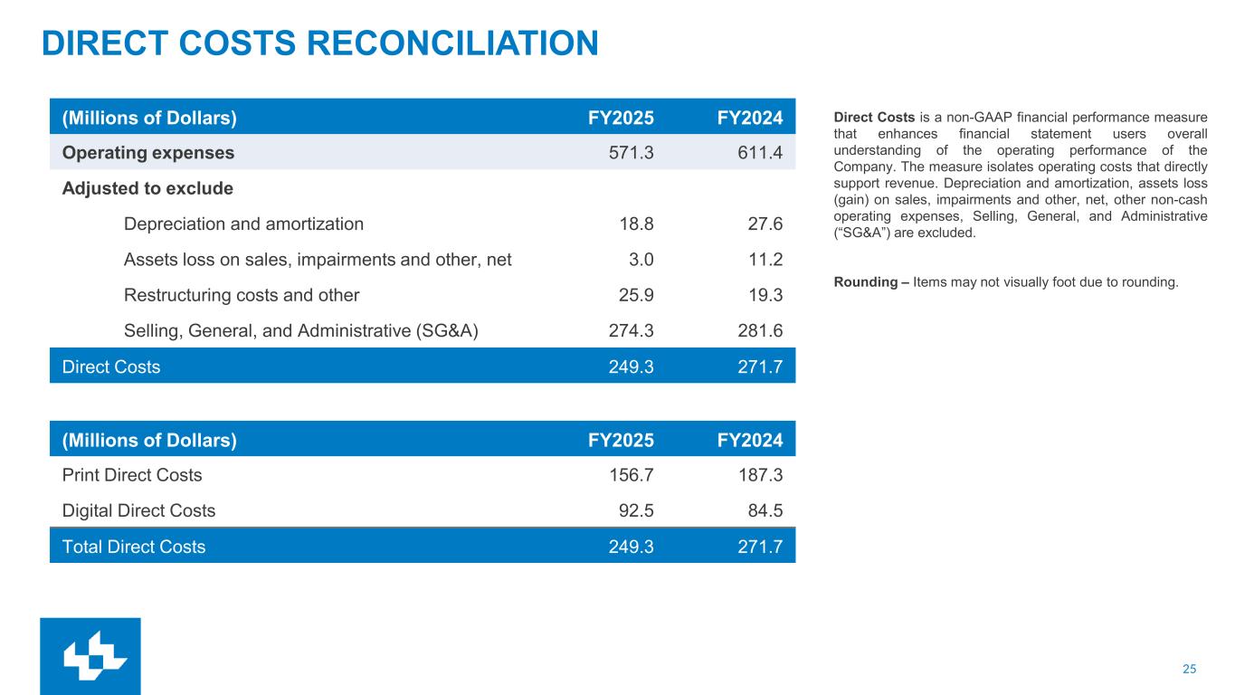 24 SAME-STORE NON-GAAP REVENUE RECONCILIATION(1) (1) Same-store revenues is a non-GAAP performance measure based on U.S. GAAP revenues for Lee for the periods presented, excluding exited operations and the extra week in the prior year. Exited operations include (1) businesses divested and (2) the elimination of stand-alone print products discontinued within our markets. Rounding – Items may not foot due to rounding. (Millions of Dollars) FY2025 FY2024 $ Change % Change Print Advertising Revenue 69.2 81.5 (12.3) -15.1% Exited operations and the extra week in the prior year (0.7) (4.7) 4.0 NM Same-store, Print Advertising Revenue 68.5 76.8 (8.3) -10.9% Digital Advertising and Marketing Services Revenue 183.8 194.2 (10.4) -5.3% Exited operations and the extra week in the prior year (0.0) (4.1) 4.1 NM Same-store, Digital Advertising and Marketing Services 183.8 190.1 (6.3) -3.3% Total Advertising Revenue 253.0 275.7 (22.7) -8.2% Exited operations and the extra week in the prior year (0.7) (8.8) 8.1 NM Same-store, Total Advertising Revenue 252.3 266.9 (14.6) -5.5% (Millions of Dollars) FY2025 FY2024 $ Change % Change Print Subscription Revenue 164.2 197.6 (33.4) -16.9% Exited operations and the extra week in the prior year (0.1) (4.8) 4.7 NM Same-store, Print Subscription Revenue 164.1 192.8 (28.7) -14.9% Digital Subscription Revenue 94.2 84.3 9.9 11.8% Exited operations and the extra week in the prior year (0.0) (3.3) 3.3 NM Same-store, Digital Subscription Revenue 94.2 81.0 13.2 16.3% Total Subscription Revenue 258.4 281.9 (23.5) -8.3% Exited operations and the extra week in the prior year (0.1) (8.1) 8.0 NM Same-store, Total Subscription Revenue 258.4 273.8 (15.5) -5.6% (Millions of Dollars) FY2025 FY2024 $ Change % Change Print Other Revenue 30.9 33.3 (2.4) -7.2% Exited operations and the extra week in the prior year (0.0) (0.5) 0.5 NM Same-store, Print Other Revenue 30.8 32.7 (1.9) -5.7% Digital Other Revenue 20.1 20.5 (0.4) -2.1% Exited operations and the extra week in the prior year - (0.1) 0.1 NM Same-store, Digital Other Revenue 20.1 20.4 (0.3) -1.6% Total Other Revenue 50.9 53.8 (2.8) -5.3% Exited operations and the extra week in the prior year (0.0) (0.6) 0.6 NM Same-store, Total Other Revenue 50.9 53.1 (2.2) -4.1% (Millions of Dollars) FY2025 FY2024 $ Change % Change Total Operating Revenue 562.3 611.4 (49.0) -8.0% Exited operations and the extra week in the prior year (0.8) (17.6) 16.8 NM Same-store, Total Operating Revenue 561.5 593.8 (32.3) -5.4%