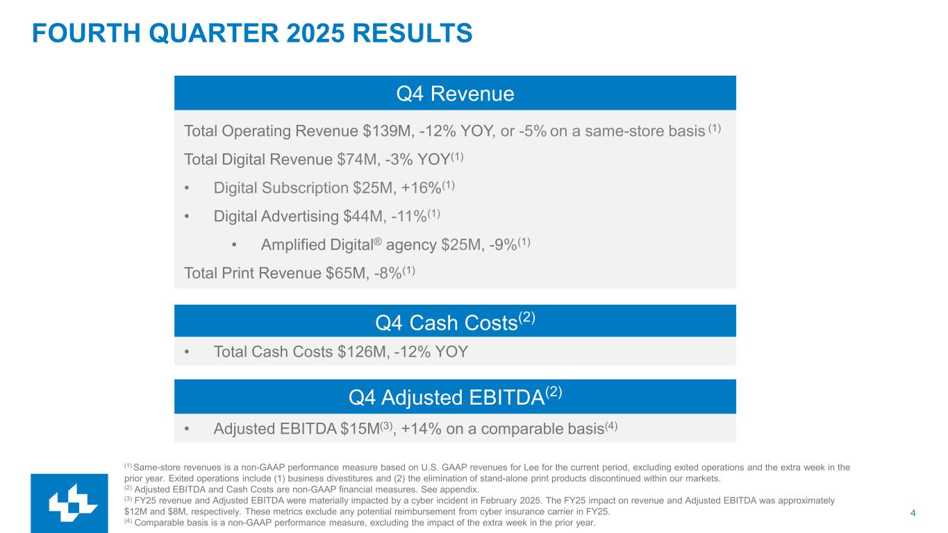 3 DIGITAL-FIRST SUBSCRIPTION PLATFORM Total Revenue $562M(3) FY25 Digital Mix of Total Revenue 53% FY25 Adjusted EBITDA(2) $45M(3) FY25 Digital Subscribers 633,000 September 2025 Industry-Leading Digital Sub Revenue Growth $94M FY25 | 16% YoY Growth(1) Lee is a dominant source of local news, information, and advertising in midsized markets Industry-Leading Digital Agency Revenue Growth $103M FY25 | 5% YoY Growth(1) (1) Same-store revenues is a non-GAAP performance measure based on U.S. GAAP revenues for Lee for the current period, excluding exited operations and the extra week in the prior year. Exited operations include (1) business divestitures and (2) the elimination of stand-alone print products discontinued within our markets. (2) Adjusted EBITDA and Cash Costs are non-GAAP financial measures. See appendix. (3) FY25 revenue and Adjusted EBITDA were materially impacted by a cyber incident in February 2025. The FY25 impact on revenue and Adjusted EBITDA was approximately $12M and $8M, respectively. These metrics exclude any potential reimbursement from cyber insurance carrier in FY25.
