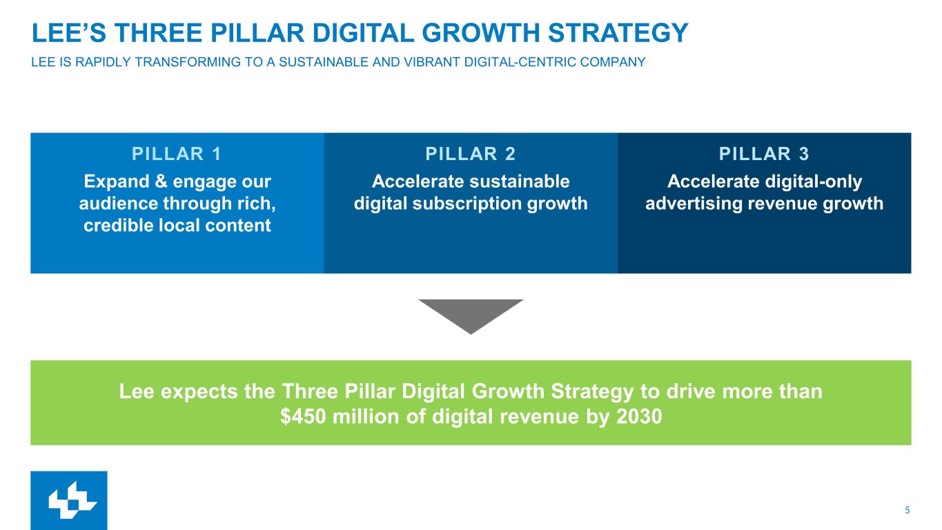 4 FOURTH QUARTER 2025 RESULTS (1) Same-store revenues is a non-GAAP performance measure based on U.S. GAAP revenues for Lee for the current period, excluding exited operations and the extra week in the prior year. Exited operations include (1) business divestitures and (2) the elimination of stand-alone print products discontinued within our markets. (2) Adjusted EBITDA and Cash Costs are non-GAAP financial measures. See appendix. (3) FY25 revenue and Adjusted EBITDA were materially impacted by a cyber incident in February 2025. The FY25 impact on revenue and Adjusted EBITDA was approximately $12M and $8M, respectively. These metrics exclude any potential reimbursement from cyber insurance carrier in FY25. (4) Comparable basis is a non-GAAP performance measure, excluding the impact of the extra week in the prior year. Q4 Revenue Total Operating Revenue $139M, -12% YOY, or -5% on a same-store basis (1) Total Digital Revenue $74M, -3% YOY(1) • Digital Subscription $25M, +16%(1) • Digital Advertising $44M, -11%(1) • Amplified Digital® agency $25M, -9%(1) Total Print Revenue $65M, -8%(1) Q4 Cash Costs(2) • Total Cash Costs $126M, -12% YOY Q4 Adjusted EBITDA(2) • Adjusted EBITDA $15M(3), +14% on a comparable basis(4)