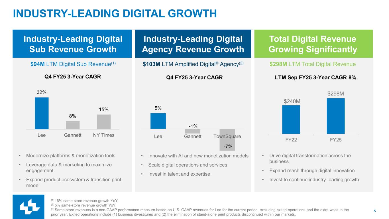 5 LEE’S THREE PILLAR DIGITAL GROWTH STRATEGY LEE IS RAPIDLY TRANSFORMING TO A SUSTAINABLE AND VIBRANT DIGITAL-CENTRIC COMPANY PILLAR 1 Expand & engage our audience through rich, credible local content PILLAR 2 Accelerate sustainable digital subscription growth PILLAR 3 Accelerate digital-only advertising revenue growth Lee expects the Three Pillar Digital Growth Strategy to drive more than $450 million of digital revenue by 2030