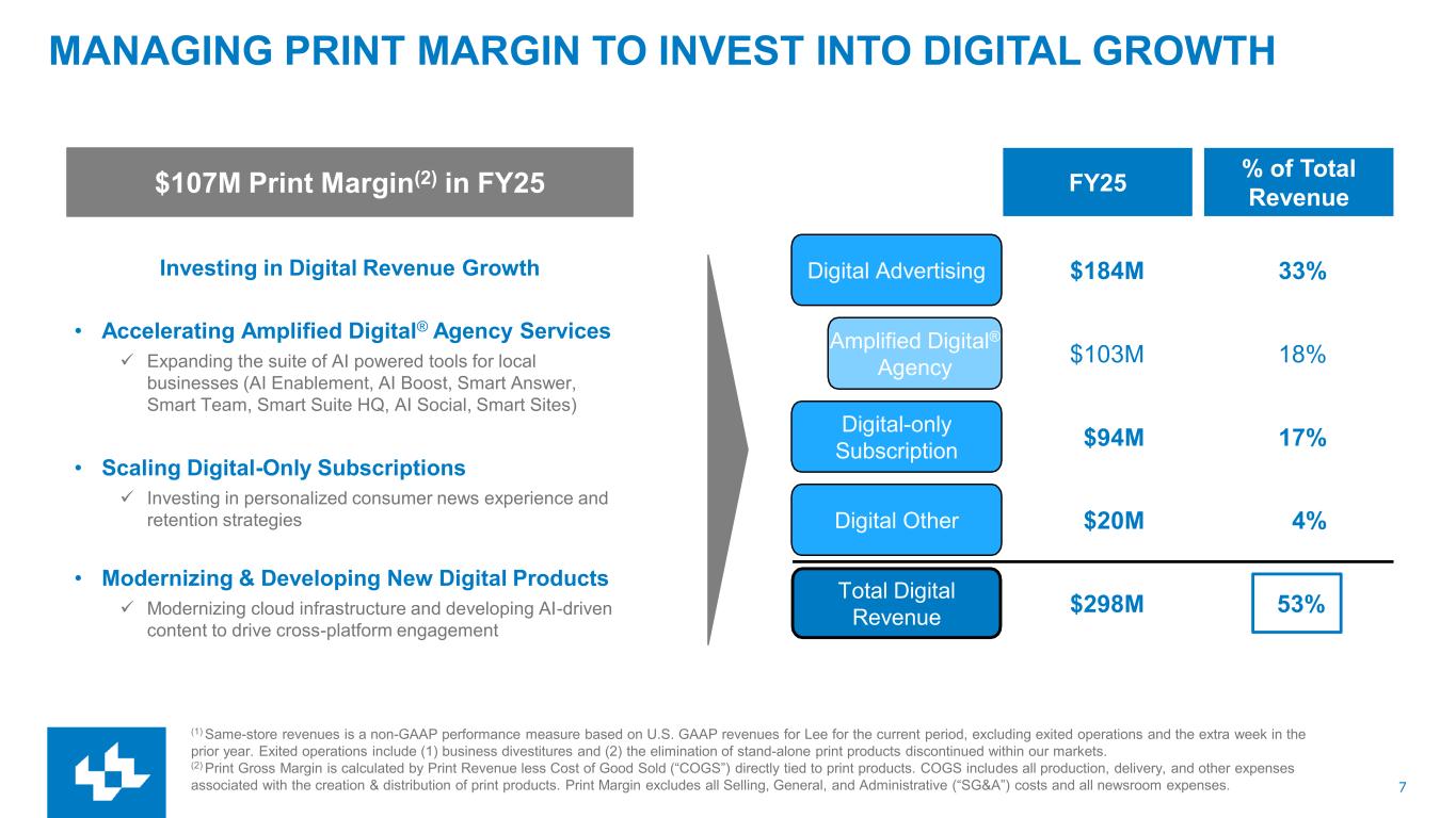 6 Industry-Leading Digital Sub Revenue Growth Industry-Leading Digital Agency Revenue Growth Total Digital Revenue Growing Significantly $94M LTM Digital Sub Revenue(1) $103M LTM Amplified Digital® Agency(2) $298M LTM Total Digital Revenue INDUSTRY-LEADING DIGITAL GROWTH (1) 16% same-store revenue growth YoY. (2) 5% same-store revenue growth YoY. (3) Same-store revenues is a non-GAAP performance measure based on U.S. GAAP revenues for Lee for the current period, excluding exited operations and the extra week in the prior year. Exited operations include (1) business divestitures and (2) the elimination of stand-alone print products discontinued within our markets. Q4 FY25 3-Year CAGR Q4 FY25 3-Year CAGR LTM Sep FY25 3-Year CAGR 8% • Modernize platforms & monetization tools • Leverage data & marketing to maximize engagement • Expand product ecosystem & transition print model • Innovate with AI and new monetization models • Scale digital operations and services • Invest in talent and expertise • Drive digital transformation across the business • Expand reach through digital innovation • Invest to continue industry-leading growth FY22 FY25 $240M $298M32% 8% 15% Lee Gannett NY Times 5% -1% -7% Lee Gannett TownSquare