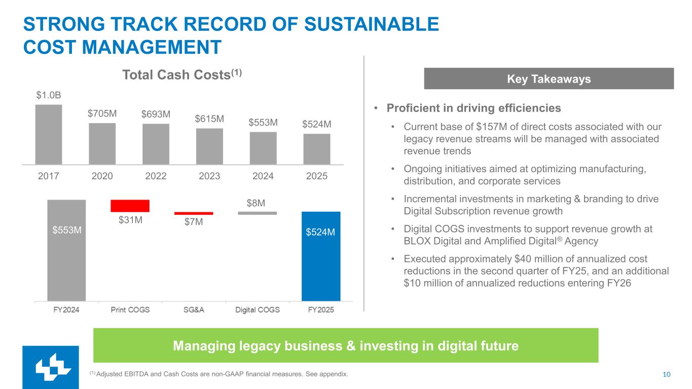 9 FY21 FY25 FY26E FY27E FY28E FY29E FY30E EXECUTION OF THREE PILLARS DRIVES SUSTAINABILITY & GROWTH Digital Transformation Digital Sustainability Digital transformation is nearing sustainability Digital gross margin(1) S&GA Key Takeaways ✓ Digital revenue replacing print revenue and growing at 12% CAGR(2) ✓ Digital subscription revenue and gross margin growing at a 35% CAGR(2) ✓ Amplified Digital® Agency revenue growing at a 25% CAGR(2) ✓ Nearing digital sustainability: Digital gross margin(1) expected to surpass SG&A costs in FY27 (1) Digital Gross Margin is a non-GAAP performance measure calculated by Digital Revenue less Cost of Good Sold (“COGS”) directly tied to digital products. Digital Gross Margin excludes all Selling, General, and Administrative (“SG&A”) costs. (2) CAGR represents the compounded annual growth rate from FY21 to FY25.