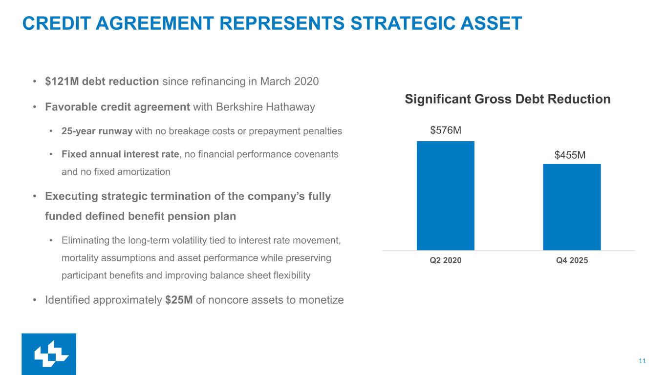 11 Q2 2020 Q4 2025 CREDIT AGREEMENT REPRESENTS STRATEGIC ASSET • $121M debt reduction since refinancing in March 2020 • Favorable credit agreement with Berkshire Hathaway • 25-year runway with no breakage costs or prepayment penalties • Fixed annual interest rate, no financial performance covenants and no fixed amortization • Executing strategic termination of the company’s fully funded defined benefit pension plan • Eliminating the long-term volatility tied to interest rate movement, mortality assumptions and asset performance while preserving participant benefits and improving balance sheet flexibility • Identified approximately $25M of noncore assets to monetize $576M $455M Significant Gross Debt Reduction