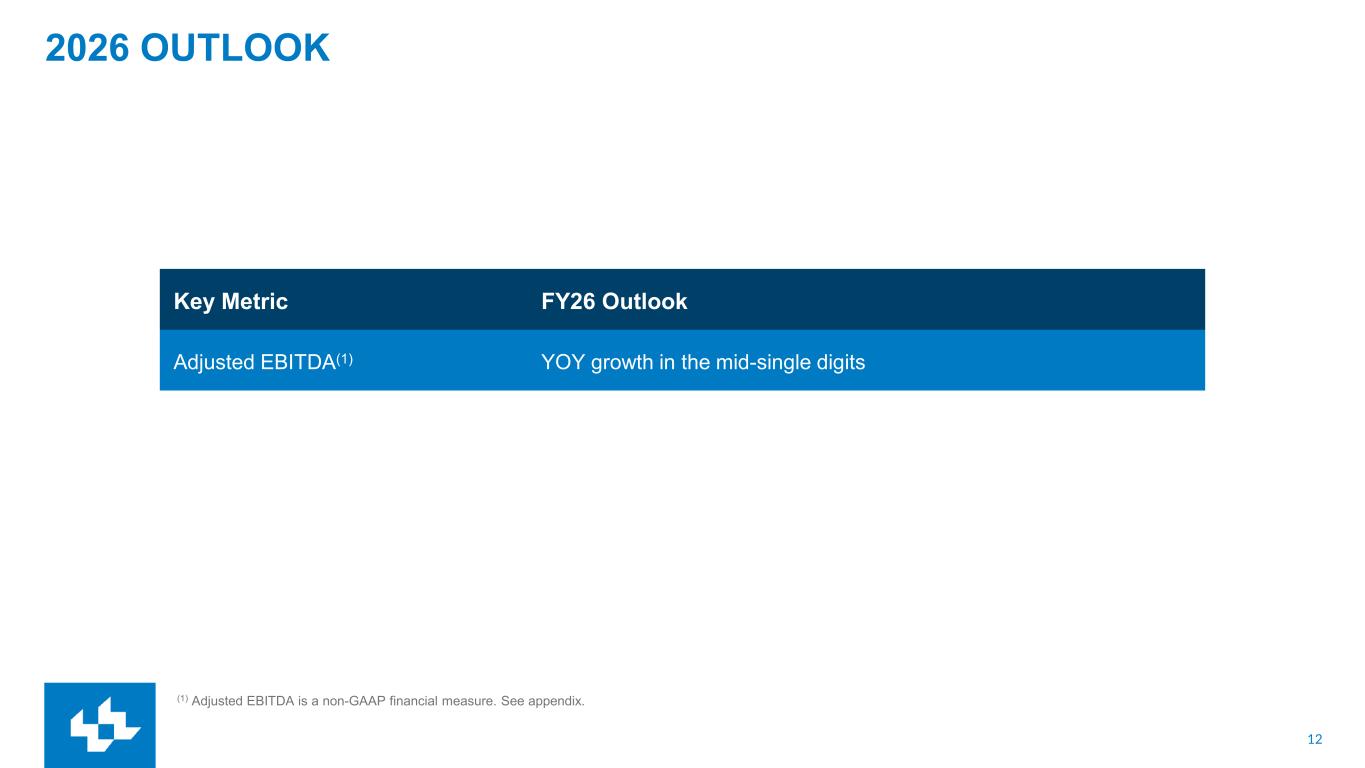 12 2026 OUTLOOK (1) Adjusted EBITDA is a non-GAAP financial measure. See appendix. Key Metric FY26 Outlook Adjusted EBITDA(1) YOY growth in the mid-single digits