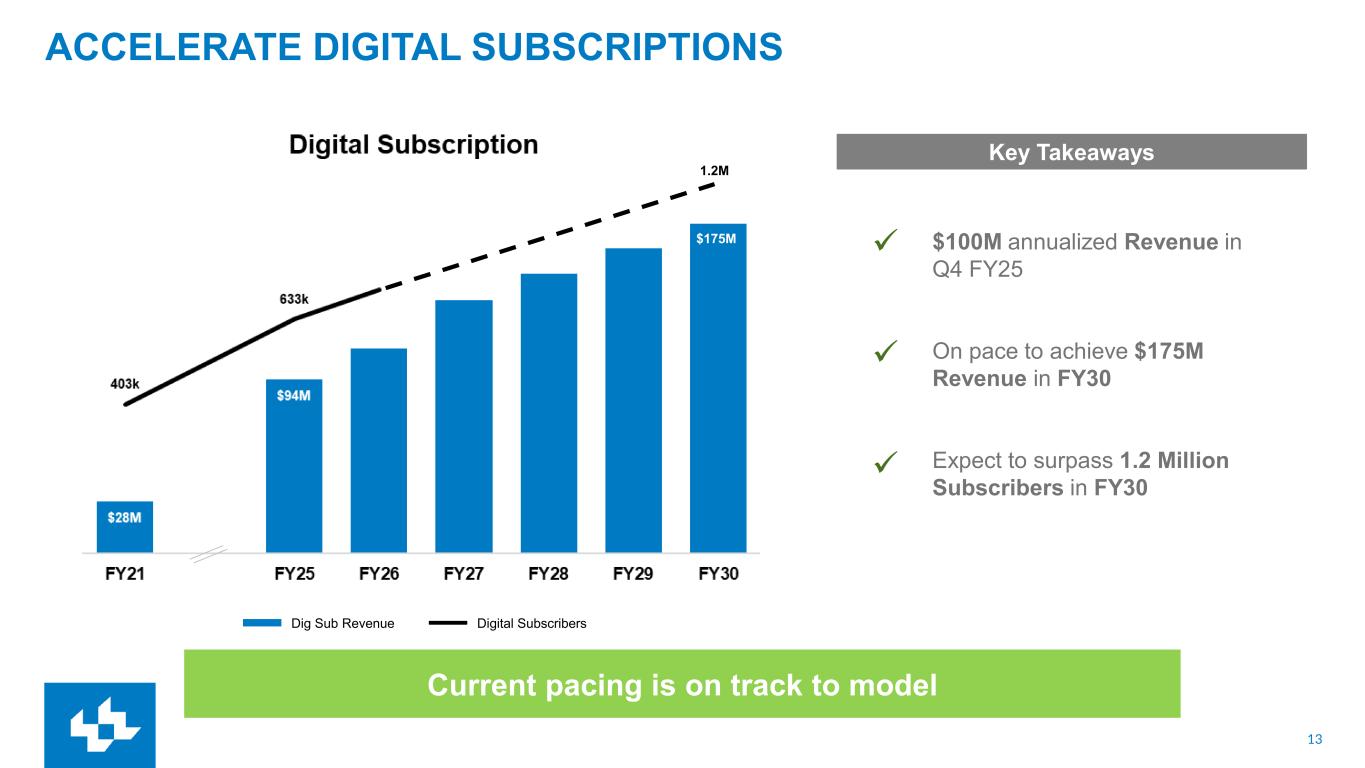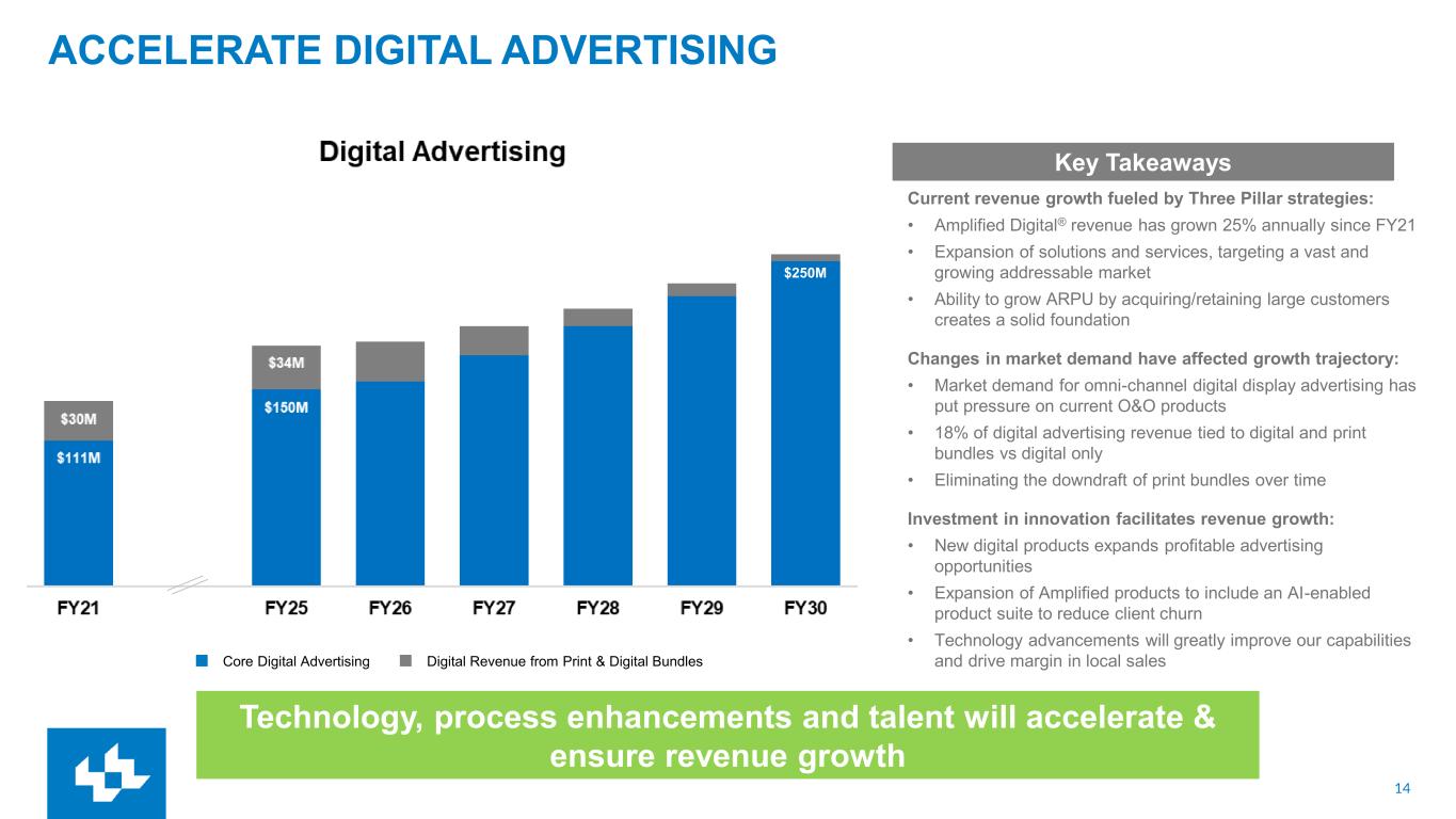 13 ACCELERATE DIGITAL SUBSCRIPTIONS Current pacing is on track to model 1.2M $100M annualized Revenue in Q4 FY25 On pace to achieve $175M Revenue in FY30 Expect to surpass 1.2 Million Subscribers in FY30 ✓ ✓ $175M Key Takeaways Dig Sub Revenue Digital Subscribers $175M ✓