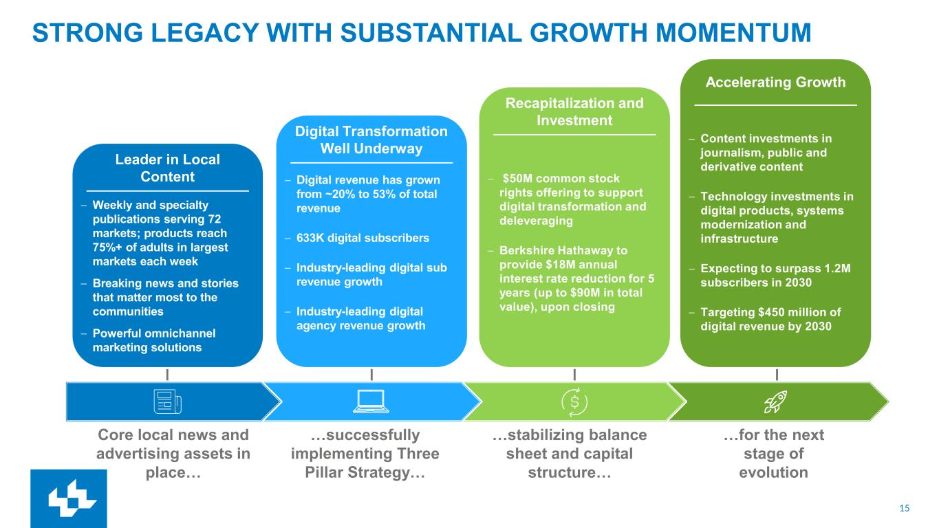 14 ACCELERATE DIGITAL ADVERTISING Technology, process enhancements and talent will accelerate & ensure revenue growth Current revenue growth fueled by Three Pillar strategies: • Amplified Digital® revenue has grown 25% annually since FY21 • Expansion of solutions and services, targeting a vast and growing addressable market • Ability to grow ARPU by acquiring/retaining large customers creates a solid foundation Changes in market demand have affected growth trajectory: • Market demand for omni-channel digital display advertising has put pressure on current O&O products • 18% of digital advertising revenue tied to digital and print bundles vs digital only • Eliminating the downdraft of print bundles over time Investment in innovation facilitates revenue growth: • New digital products expands profitable advertising opportunities • Expansion of Amplified products to include an AI-enabled product suite to reduce client churn • Technology advancements will greatly improve our capabilities and drive margin in local sales $250M $250M Core Digital Advertising Digital Revenue from Print & Digital Bundles Key Takeaways