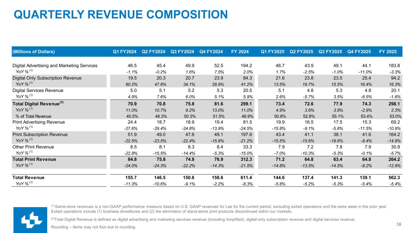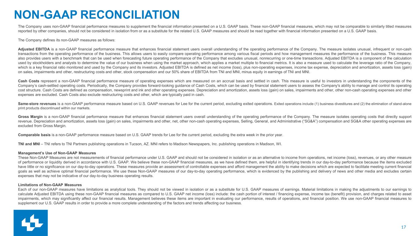 17 NON-GAAP RECONCILIATION The Company uses non-GAAP financial performance measures to supplement the financial information presented on a U.S. GAAP basis. These non-GAAP financial measures, which may not be comparable to similarly titled measures reported by other companies, should not be considered in isolation from or as a substitute for the related U.S. GAAP measures and should be read together with financial information presented on a U.S. GAAP basis. The Company defines its non-GAAP measures as follows: Adjusted EBITDA is a non-GAAP financial performance measure that enhances financial statement users overall understanding of the operating performance of the Company. The measure isolates unusual, infrequent or non-cash transactions from the operating performance of the business. This allows users to easily compare operating performance among various fiscal periods and how management measures the performance of the business. This measure also provides users with a benchmark that can be used when forecasting future operating performance of the Company that excludes unusual, nonrecurring or one-time transactions. Adjusted EBITDA is a component of the calculation used by stockholders and analysts to determine the value of our business when using the market approach, which applies a market multiple to financial metrics. It is also a measure used to calculate the leverage ratio of the Company, which is a key financial ratio monitored and used by the Company and its investors. Adjusted EBITDA is defined as net income (loss), plus non-operating expenses, income tax expense, depreciation and amortization, assets loss (gain) on sales, impairments and other, restructuring costs and other, stock compensation and our 50% share of EBITDA from TNI and MNI, minus equity in earnings of TNI and MNI. Cash Costs represent a non-GAAP financial performance measure of operating expenses which are measured on an accrual basis and settled in cash. This measure is useful to investors in understanding the components of the Company’s cash-settled operating costs. Periodically, the Company provides forward-looking guidance of Cash Costs, which can be used by financial statement users to assess the Company's ability to manage and control its operating cost structure. Cash Costs are defined as compensation, newsprint and ink and other operating expenses. Depreciation and amortization, assets loss (gain) on sales, impairments and other, other non-cash operating expenses and other expenses are excluded. Cash Costs also exclude restructuring costs and other, which are typically paid in cash. Same-store revenues is a non-GAAP performance measure based on U.S. GAAP revenues for Lee for the current period, excluding exited operations. Exited operations include (1) business divestitures and (2) the elimination of stand-alone print products discontinued within our markets. Gross Margin is a non-GAAP financial performance measure that enhances financial statement users overall understanding of the operating performance of the Company. The measure isolates operating costs that directly support revenue. Depreciation and amortization, assets loss (gain) on sales, impairments and other, net, other non-cash operating expenses, Selling, General, and Administrative (“SG&A”) compensation and SG&A other operating expenses are excluded from Gross Margin. Comparable basis is a non-GAAP performance measure based on U.S. GAAP trends for Lee for the current period, excluding the extra week in the prior year. TNI and MNI – TNI refers to TNI Partners publishing operations in Tucson, AZ. MNI refers to Madison Newspapers, Inc. publishing operations in Madison, WI. Management’s Use of Non-GAAP Measures These Non-GAAP Measures are not measurements of financial performance under U.S. GAAP and should not be considered in isolation or as an alternative to income from operations, net income (loss), revenues, or any other measure of performance or liquidity derived in accordance with U.S. GAAP. We believe these non-GAAP financial measures, as we have defined them, are helpful in identifying trends in our day-to-day performance because the items excluded have little or no significance on our day-to-day operations. These measures provide an assessment of controllable expenses and afford management the ability to make decisions which are expected to facilitate meeting current financial goals as well as achieve optimal financial performance. We use these Non-GAAP measures of our day-to-day operating performance, which is evidenced by the publishing and delivery of news and other media and excludes certain expenses that may not be indicative of our day-to-day business operating results. Limitations of Non-GAAP Measures Each of our non-GAAP measures have limitations as analytical tools. They should not be viewed in isolation or as a substitute for U.S. GAAP measures of earnings. Material limitations in making the adjustments to our earnings to calculate Adjusted EBITDA using these non-GAAP financial measures as compared to U.S. GAAP net income (loss) include: the cash portion of interest / financing expense, income tax (benefit) provision, and charges related to asset impairments, which may significantly affect our financial results. Management believes these items are important in evaluating our performance, results of operations, and financial position. We use non-GAAP financial measures to supplement our U.S. GAAP results in order to provide a more complete understanding of the factors and trends affecting our business.