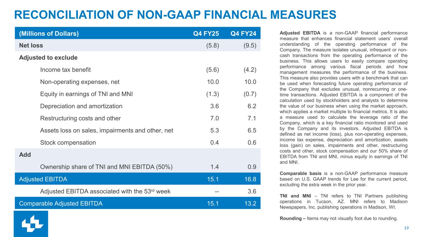18 QUARTERLY REVENUE COMPOSITION (1) Same-store revenues is a non-GAAP performance measure based on U.S. GAAP revenues for Lee for the current period, excluding exited operations and the extra week in the prior year. Exited operations include (1) business divestitures and (2) the elimination of stand-alone print products discontinued within our markets. (2)Total Digital Revenue is defined as digital advertising and marketing services revenue (including Amplified), digital-only subscription revenue and digital services revenue. Rounding – Items may not foot due to rounding. (Millions of Dollars) Q1 FY2024 Q2 FY2024 Q3 FY2024 Q4 FY2024 FY 2024 Q1 FY2025 Q2 FY2025 Q3 FY2025 Q4 FY2025 FY 2025 Digital Advertising and Marketing Services 46.5 45.4 49.9 52.5 194.2 46.7 43.9 49.1 44.1 183.8 YoY % (1) -1.1% -0.2% 1.6% 7.5% 2.0% 1.7% -2.5% -1.0% -11.0% -3.3% Digital Only Subscription Revenue 19.5 20.3 20.7 23.9 84.3 21.6 23.8 23.5 25.4 94.2 YoY % (1) 60.2% 47.6% 34.1% 29.9% 41.2% 13.5% 19.7% 15.5% 16.4% 16.3% Digital Services Revenue 5.0 5.1 5.2 5.3 20.5 5.1 4.8 5.3 4.8 20.1 YoY % (1) 4.9% 7.6% 6.0% 5.1% 5.9% 2.6% -5.7% 3.5% -6.5% -1.6% Total Digital Revenue (2) 70.9 70.8 75.8 81.6 299.1 73.4 72.6 77.9 74.3 298.1 YoY % (1) 11.0% 10.7% 9.2% 13.0% 11.0% 4.9% 3.6% 3.8% -2.9% 2.3% % of Total Revenue 45.5% 48.3% 50.3% 51.5% 48.9% 50.8% 52.8% 55.1% 53.4% 53.0% Print Advertising Revenue 24.4 18.7 18.9 19.4 81.5 19.9 16.5 17.5 15.3 69.2 YoY % (1) -27.6% -29.4% -24.8% -13.9% -24.5% -15.8% -9.1% -5.8% -11.5% -10.9% Print Subscription Revenue 51.9 49.0 47.6 49.1 197.6 43.4 41.1 38.1 41.6 164.2 YoY % (1) -22.5% -23.5% -22.4% -15.9% -21.2% -15.5% -15.6% -19.6% -8.4% -14.9% Other Print Revenue 8.5 8.1 8.3 8.4 33.3 7.9 7.2 7.8 7.9 30.9 YoY % (1) -22.8% -15.5% -14.4% -5.3% -15.0% -7.0% -10.3% -5.3% -0.1% -5.7% Total Print Revenue 84.8 75.8 74.8 76.9 312.3 71.2 64.8 63.4 64.8 264.2 YoY % (1) -24.0% -24.3% -22.2% -14.3% -21.5% -14.8% -13.5% -14.5% -8.2% -12.9% Total Revenue 155.7 146.5 150.6 158.6 611.4 144.6 137.4 141.3 139.1 562.3 YoY % (1) -11.3% -10.6% -9.1% -2.2% -8.3% -5.8% -5.2% -5.3% -5.4% -5.4%